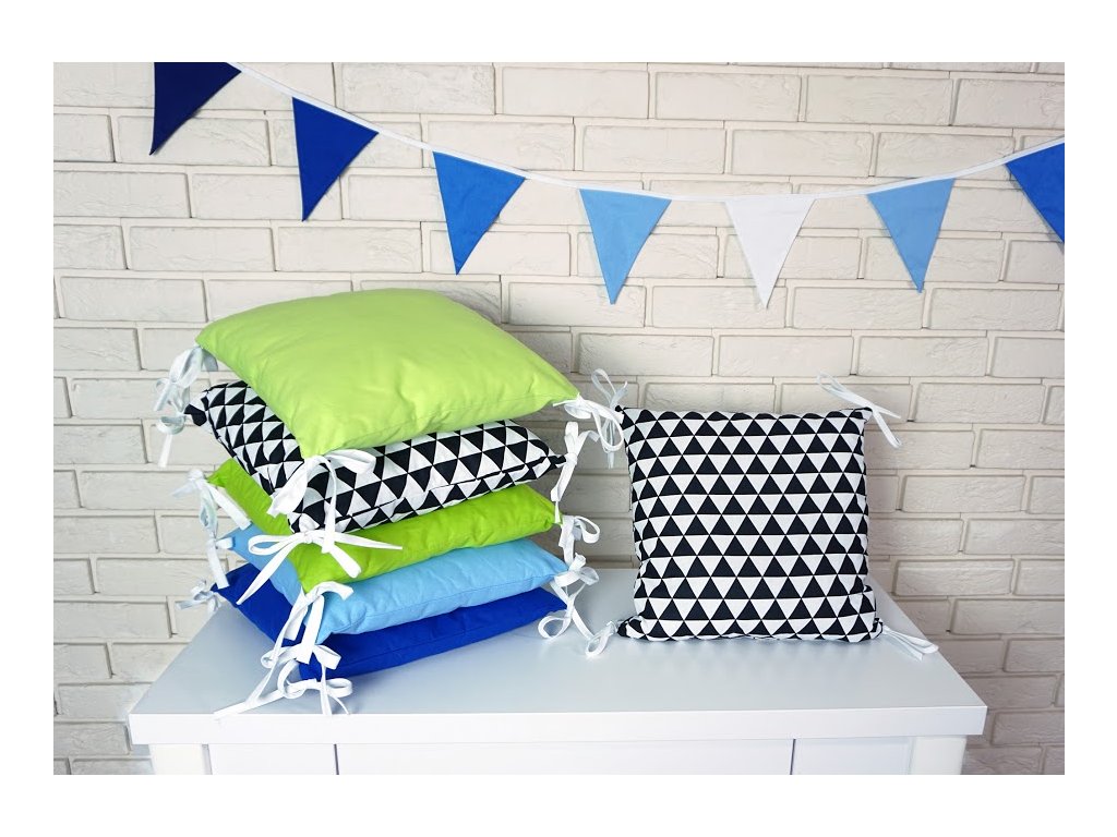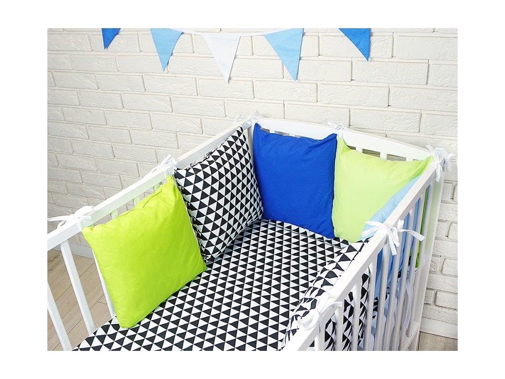Baby Nellys Polštářkový mantinel s povlečením - trojúhelníčky, černá/modrá/zelená
