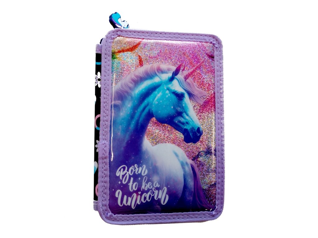 Dvoupatrový školní penál s motivem jednorožce je jako stvořený pro malé školáky a školandy, kteří milují kouzelný svět fantazie.Přední stranu zdobí nádherný obrázek jednorožce na třpytivém pozadí, doplněný o jemné fialové lemování a přívěsek ve tvaru jednorožce, který dodává penálu výjimečný vzhled.