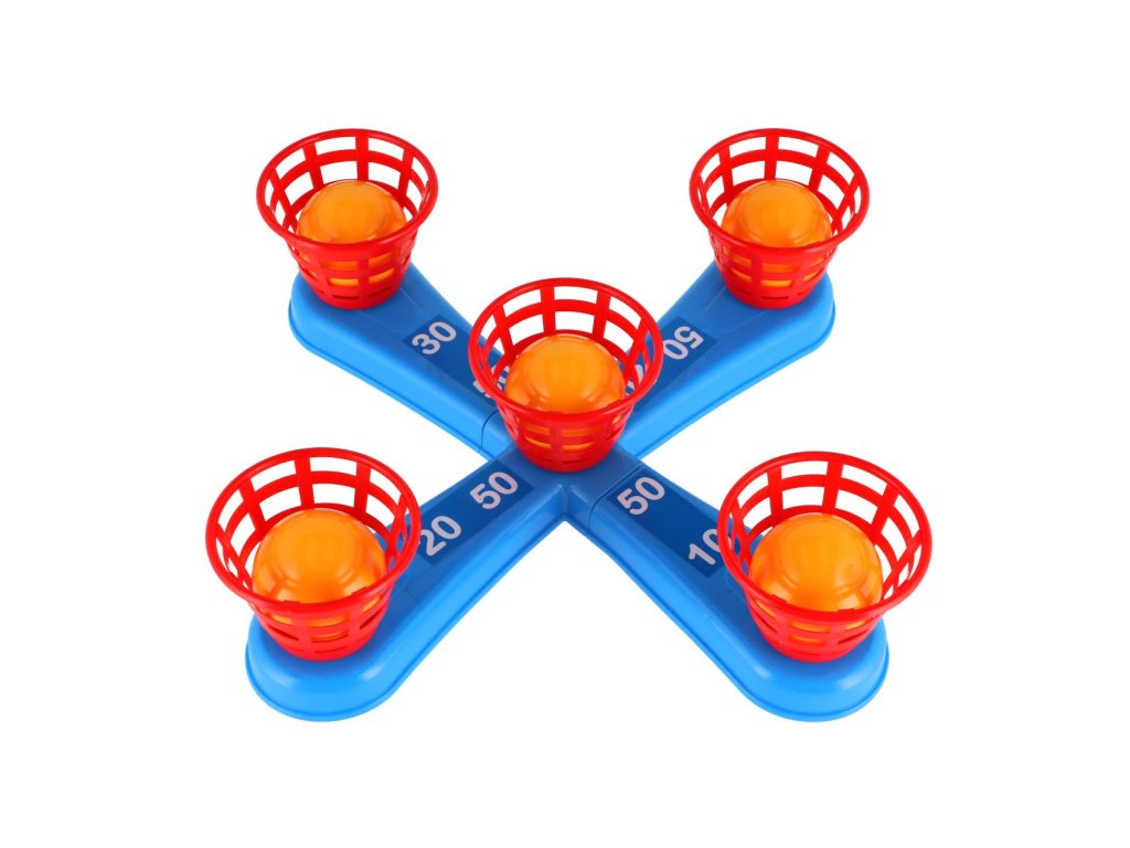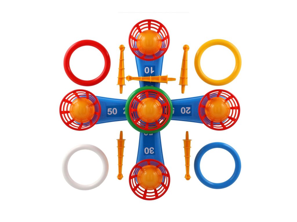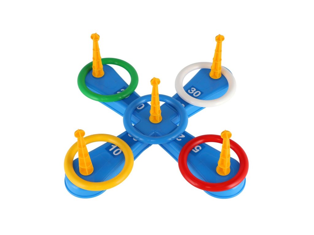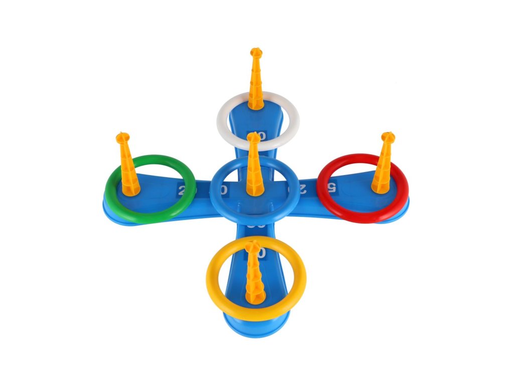 Zábavná hra, při které se hází kroužky na kříž. Balení obsahuje kříž s pěti hroty a pět barevných kroužků. Jednotlivé dílky jsou vyrobené z plastu. Tato hra se bude líbit zejména nejmenším dětem, které mohou sbírat body za každý hod, kdy se jim podaří umístit kroužek na hrot. Natrénují si také přesnost a trpělivost. Druhá hra funguje na stejný princip, ale hroty nahradily košíčky na míčky.Vhodné od 3 let.