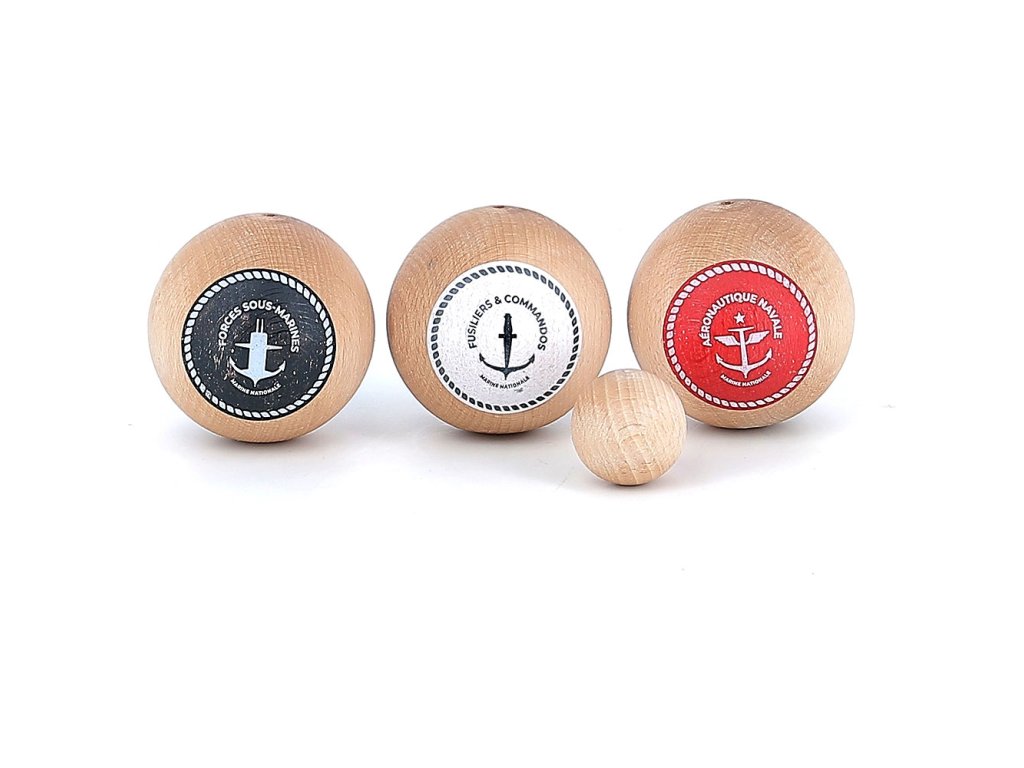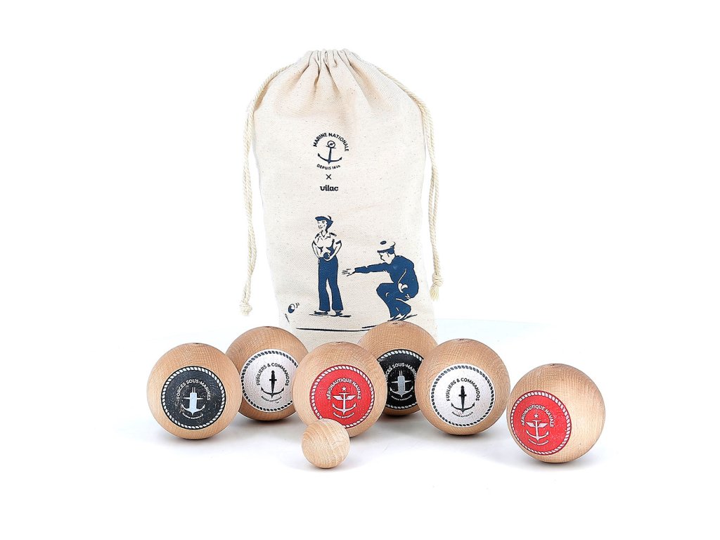 Sada na tradiční pétanque hru s motivem francouzkého národního námořnictva. Balena v praktickém látkovém pytlíku. Sada je vyrobena z masivního lakovaného dřeva.