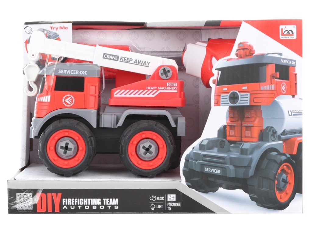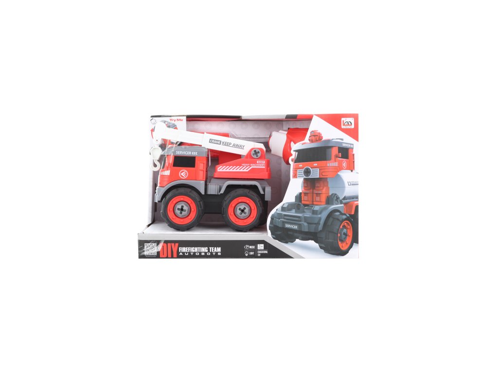 Šroubovací hasičské auto na dálkové ovládání. Auto lze sešroubovat pomocí přiloženého šroubováku nebo vrtačky. Z vrtačky lze vyndat motorek, který se vloží do auta a to poté jezdí pomocí ovládání dopředu a dozadu. Auto lze také transformovat na robota. Auto také vydává zvuky a svítí. Napájení na 4 AAA baterie (nejsou součástí) a na 3 LR41 baterie (jsou součástí). Rozměry hasičského auta cca 16 x 13 x 10 cm. Rozměry balení cca 26,5 x 14 x 17,5 cm. Věk 3+Doplňkové parametry