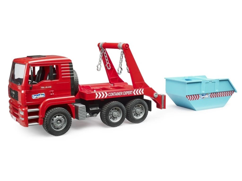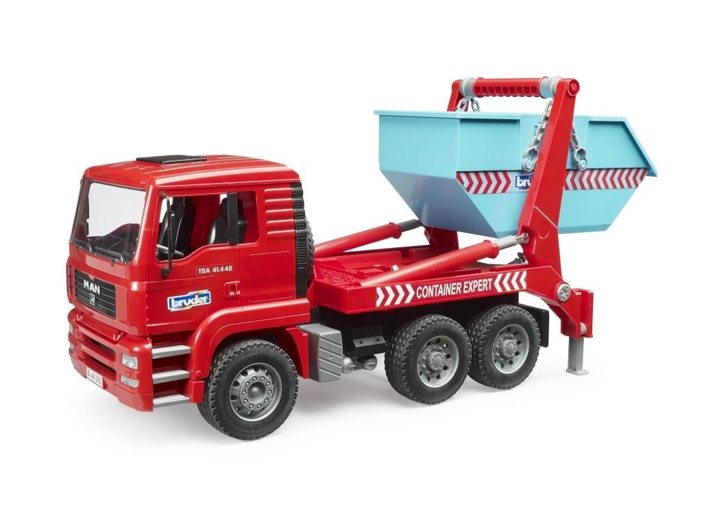 Kontejnery najdete téměř na každém staveništi - umožňují nakládat suť, zeminu i další materiály, aniž by musel celý nákladní vůz zbytečně čekat. Tento nákladadní vůz MAN TGA s kontejnerem přináší princip do světa dětské hry jako další vozidlo z řady užitkových strojů. Kontejner lze naložit i vyložit jediným pohybem ruky. Po odstranění řetězů může zůstat stát na místě a nákladní vůz je ihned připraven na další jízdy. Pro lepší stabilitu při manipulaci jsou k dispozici vysouvací podpěry. Sklopná kabina MAN TGA umožňuje nahlédnout na motorový blok a přináší do hry autentickou atmosféru a zábavu plnou realistických funkcí.