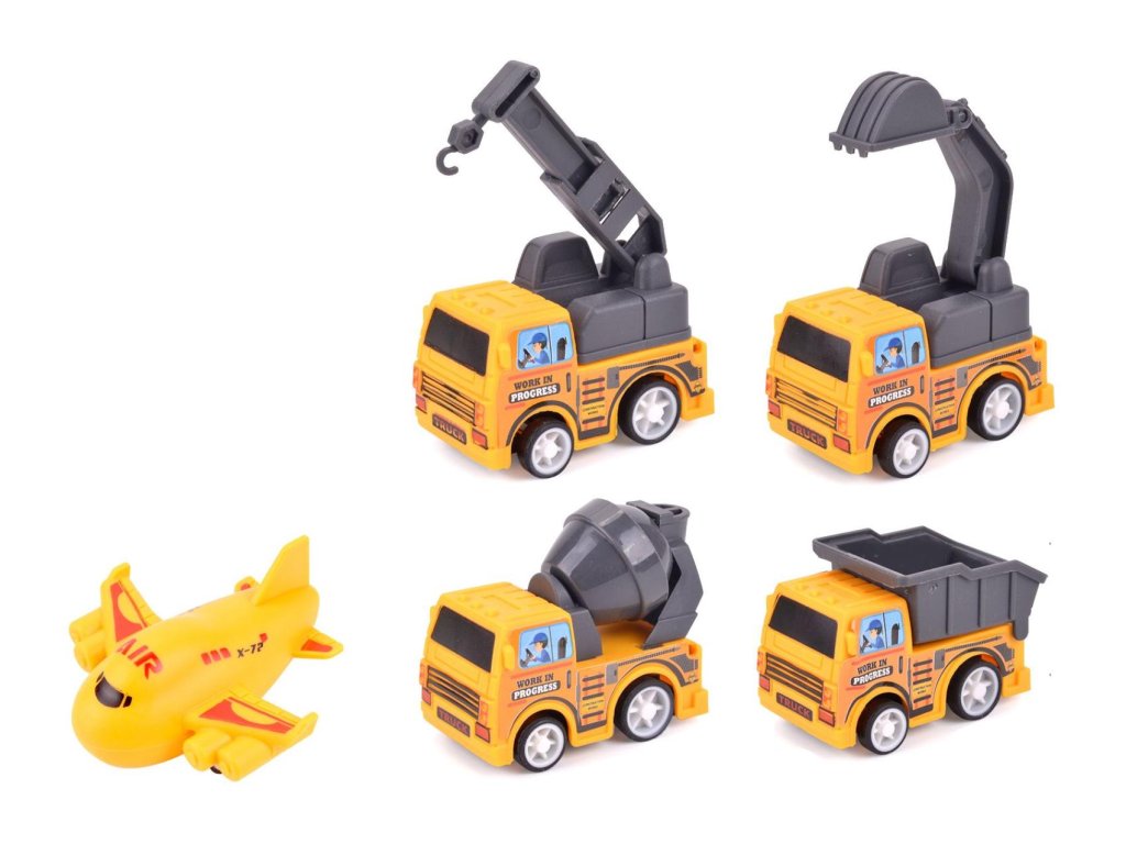 Stavební stroj mini 4ks+letadlo plast 5-7cm na zpětné natažení v blistru 23x22cm