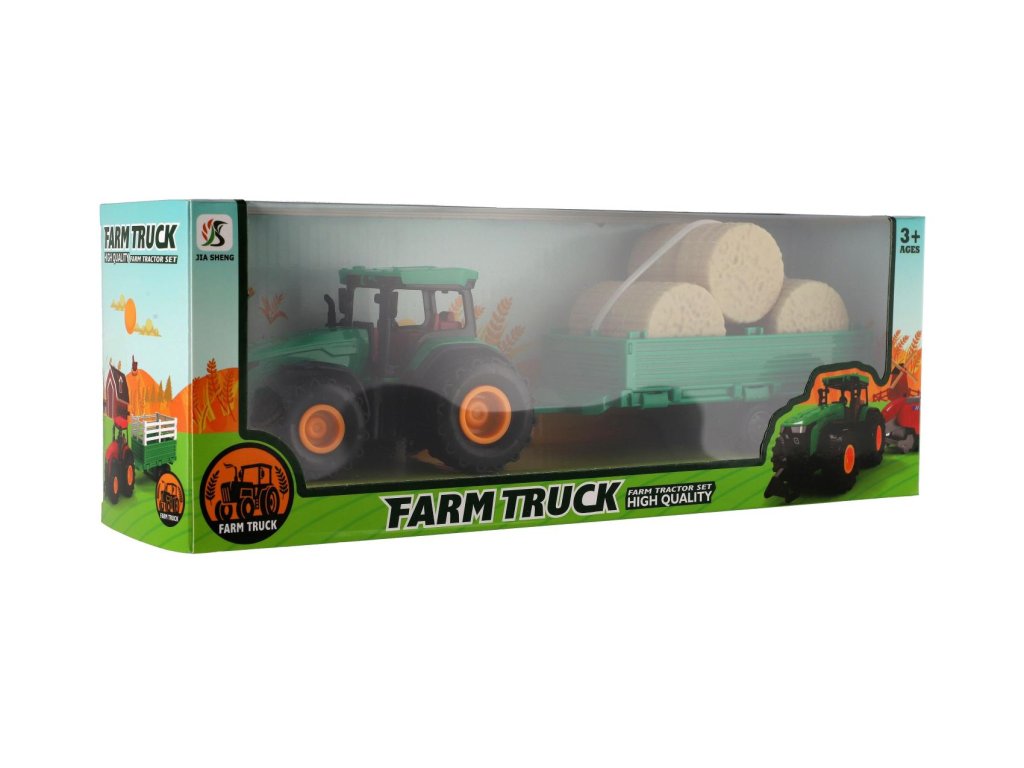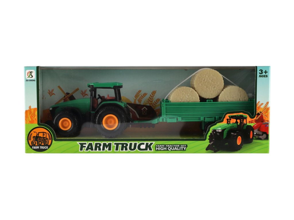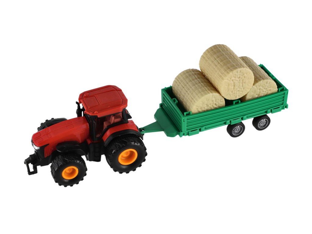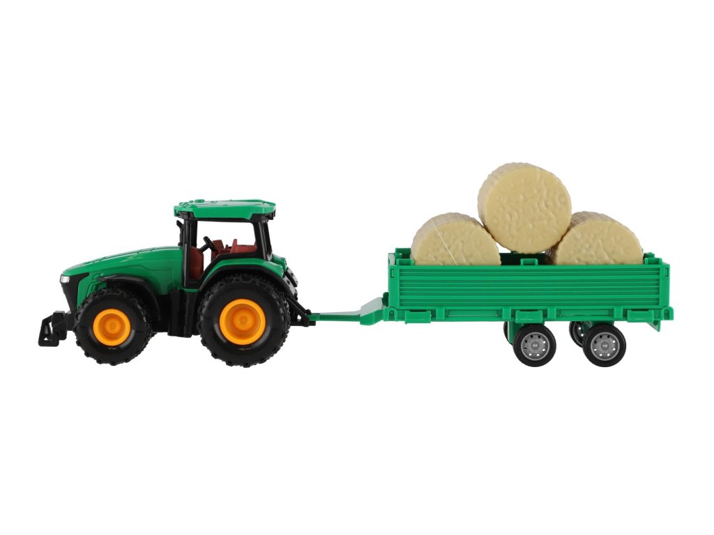 Pro každého malého zemědělce je nepostradatelným, všestranným pomocníkem traktor s přívěsem. Traktor je na setrvačník a je velikosti 30 cm. Nekonečná práce na farmě může začít. Vlek s balíkama je možné odpojit.