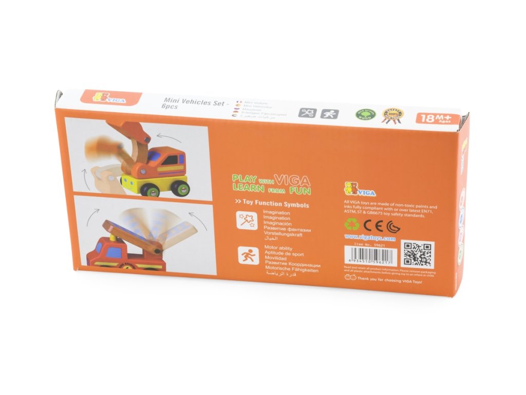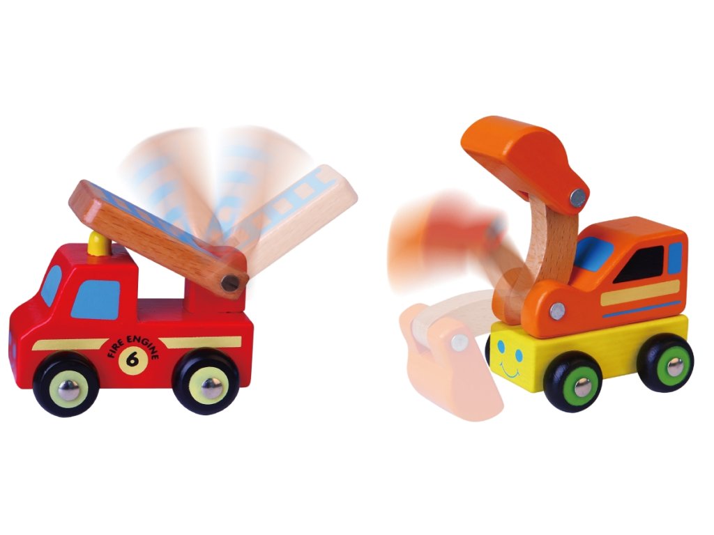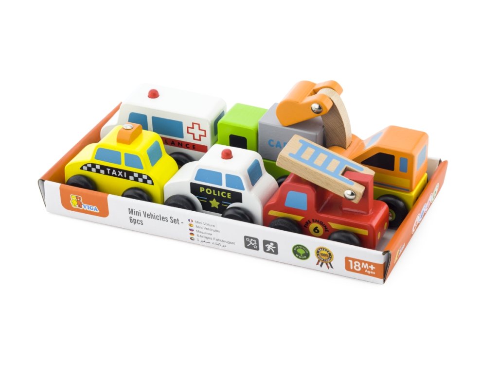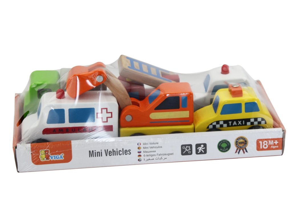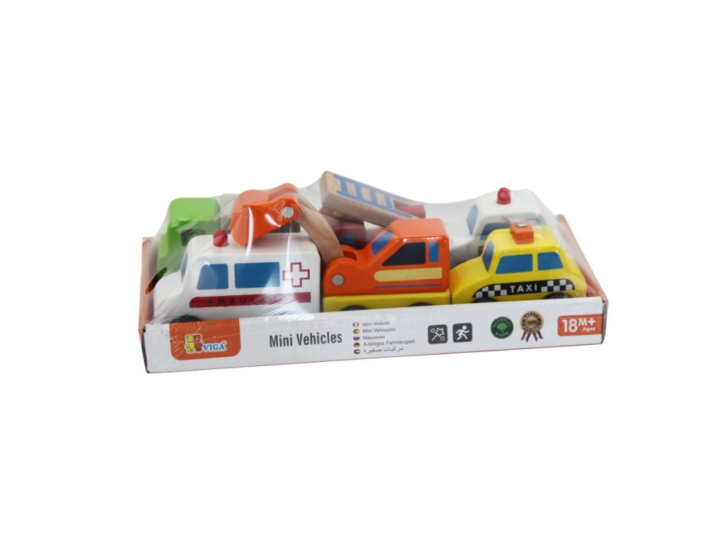 Sada 6 ks dřevěných autíček - taxi,ambulance,bagr,policie,požární auto,nákladní auto.Rozměry auta cca 10 x 6 x 3 cm (dle druhu). Rozměry balení cca 25 x 7 x 12,5 cm. Věk 18m+Doplňkové parametry