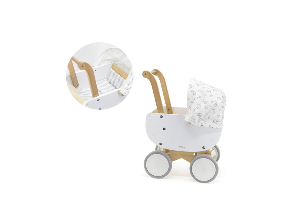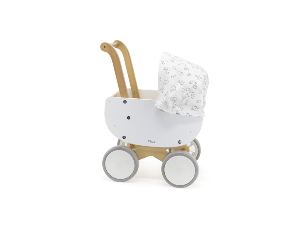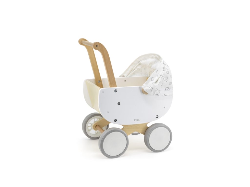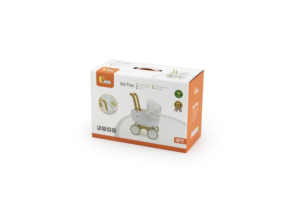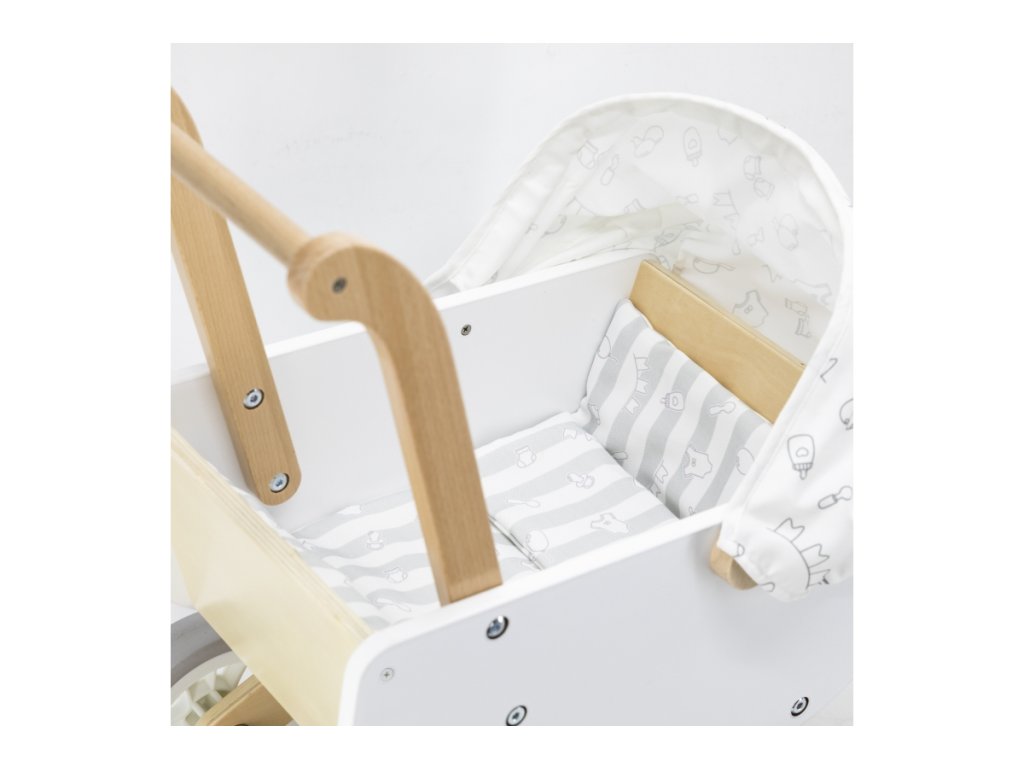 Dřevěný hluboký kočárek. S látkovou stříškou lze hýbat. Rozměry balení cca 40x27,5x19 cm. Rozměry kočárku 38,5x29,5x54 cm. Věk 18m+Doplňkové parametry
