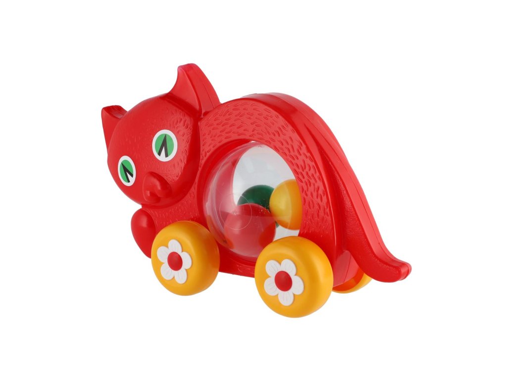 Barevná tahací kočička pro nejmenší děti s míčky, které se pohybují, když dítě hračku táhne. Nostalgická dětská hračka mnoha generací.Rozměr 27x16x10 cm.