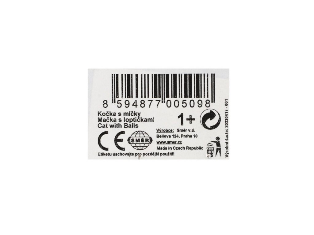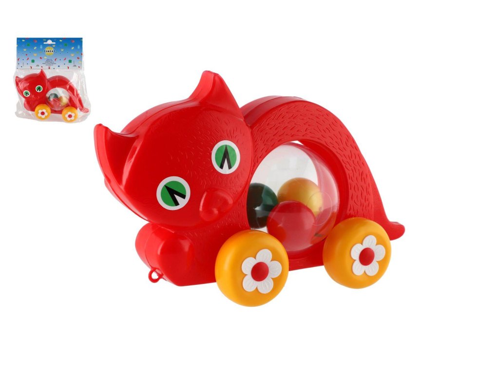 Kočka s míčky tahací plast 27x16x10cm v sáčku 12m+