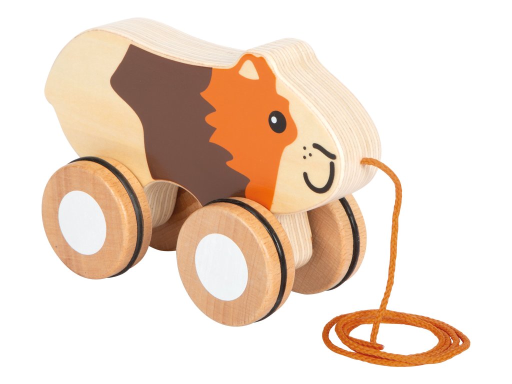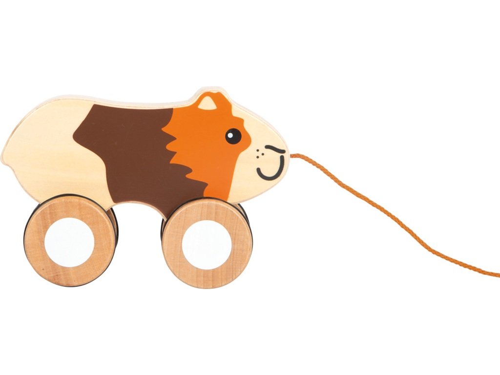 Roztomilé morče na provázku vyrobené z vysoce kvalitního pevného dřeva se jistě stane nezapomenutelným kamarádem každého dítka při jeho prvních samostatných krůčcích. Morčátko na kolečkách se dá snadno táhnout na provázku a povzbuzuje malé děti k lezení a chůzi. Užijí si tak při procházkách spoustu zábavy. Pogumovaná kolečka napomáhají plynulé a tiché jízdě. Hračka podporuje rozvoj motorických dovedností a pohyblivosti.