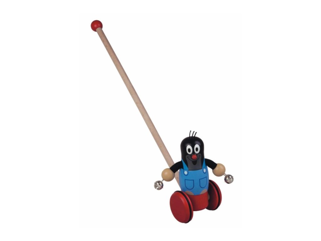 Strkadlo Krtek dřevo 55cm na kolečkách tlačící s tyčkou