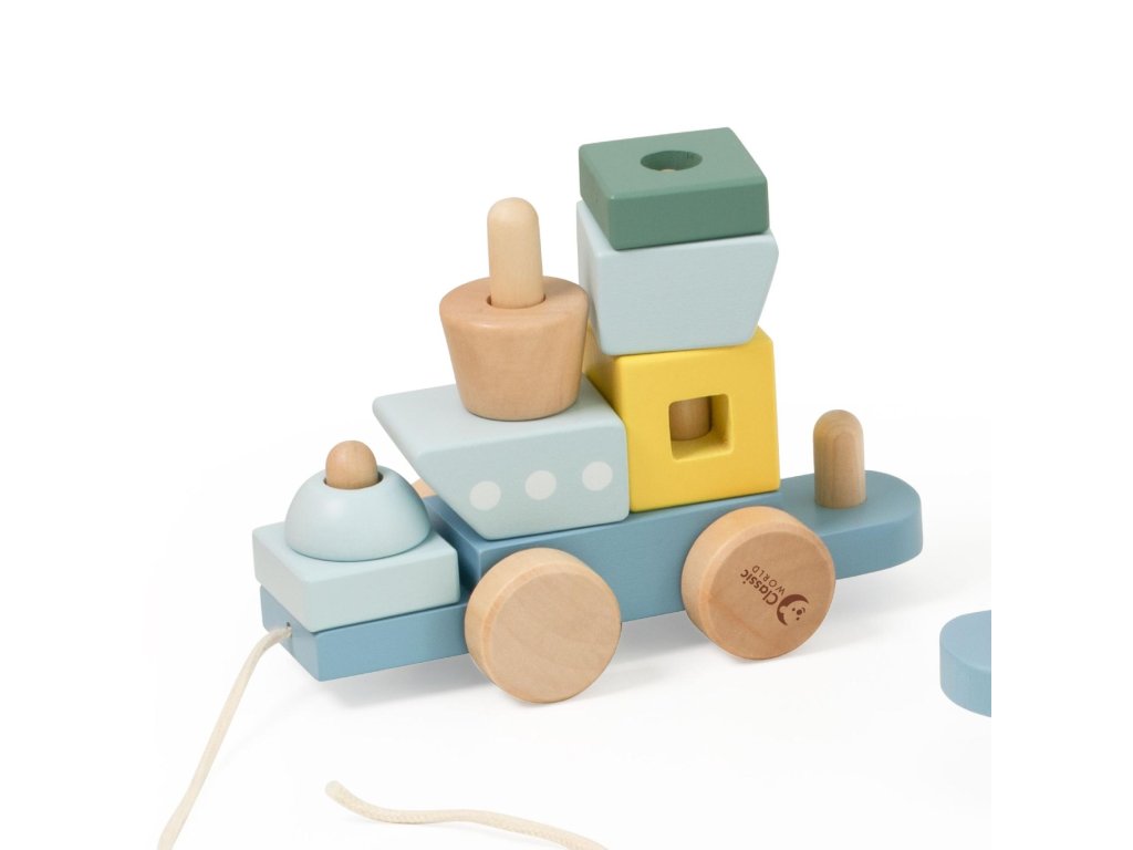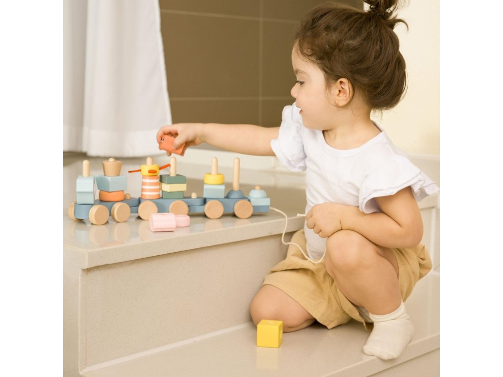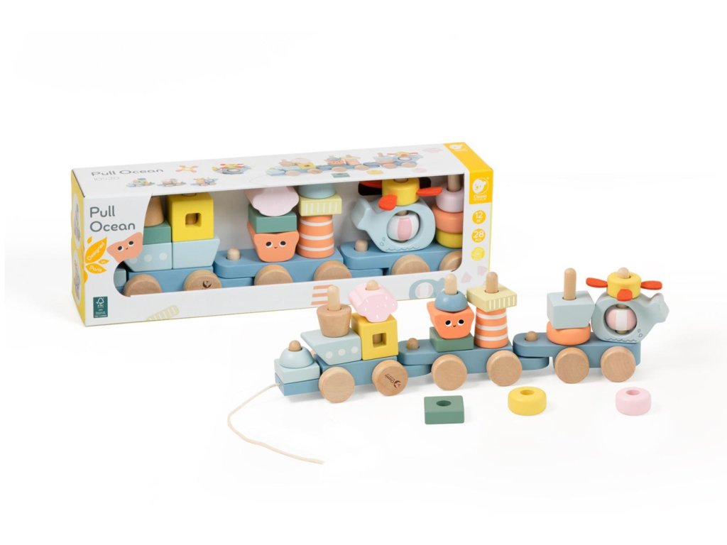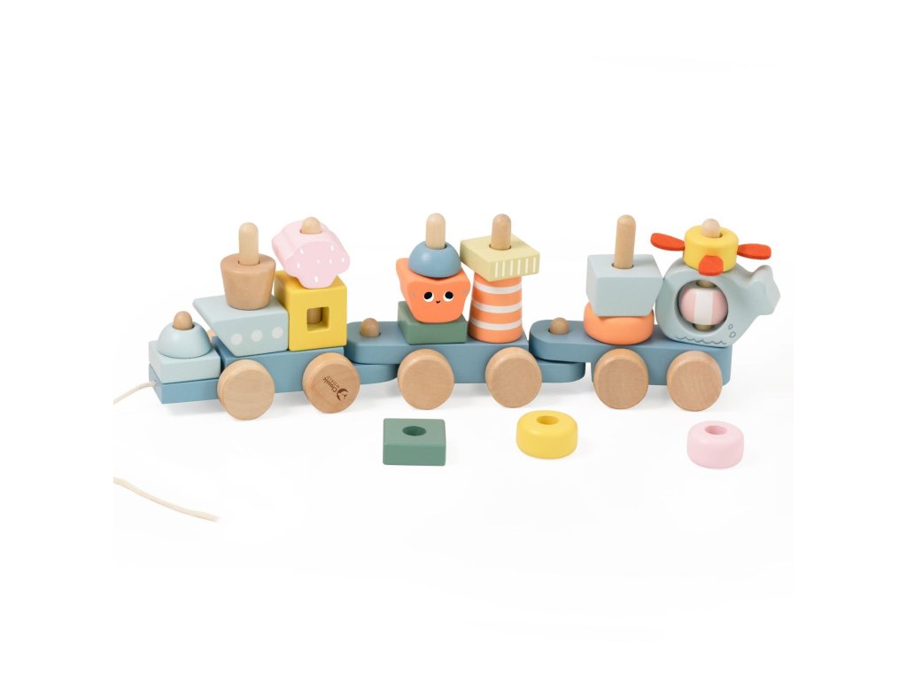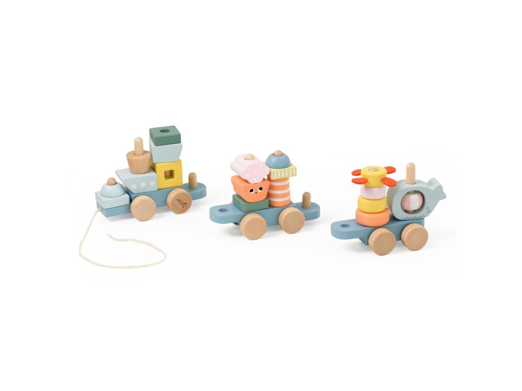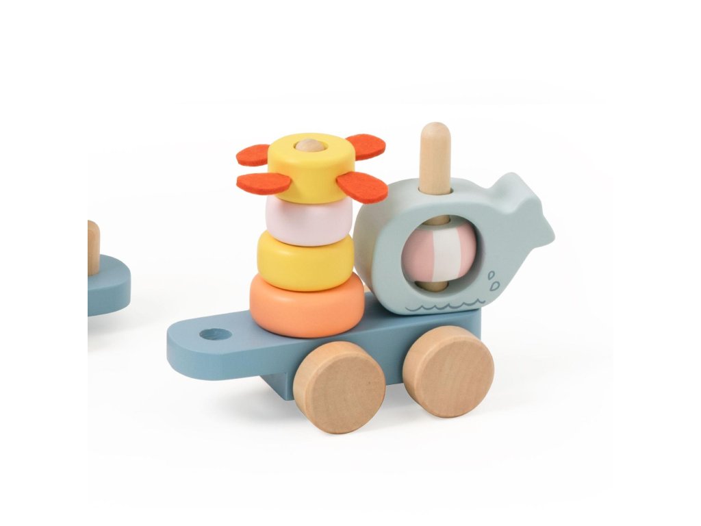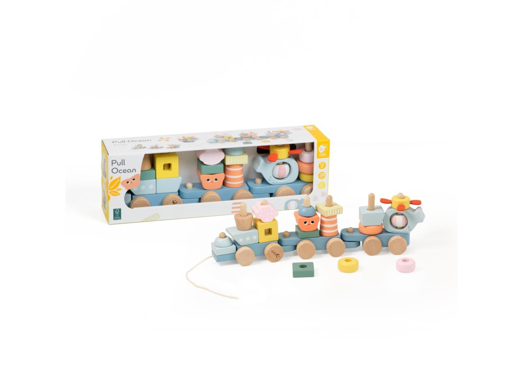 Barevný dřevěný vláček s motivem oceánu přináší zábavu na kolečkách i při skládání! Skládá se z lokomotivy a dvou vagónků, které jsou osazeny dřevěnými kolíky pro navlékání 28 různorodých dílků. Děti si rozvíjejí jemnou motoriku, učí se barvy, tvary i logiku skládání. Díky tahacímu provázku si mohou vláček snadno vzít s sebou po celém bytě. Hrací set v jemných pastelových barvách zaujme každé zvídavé batole.Rozměr balení: 38 × 12 × 8 cm
