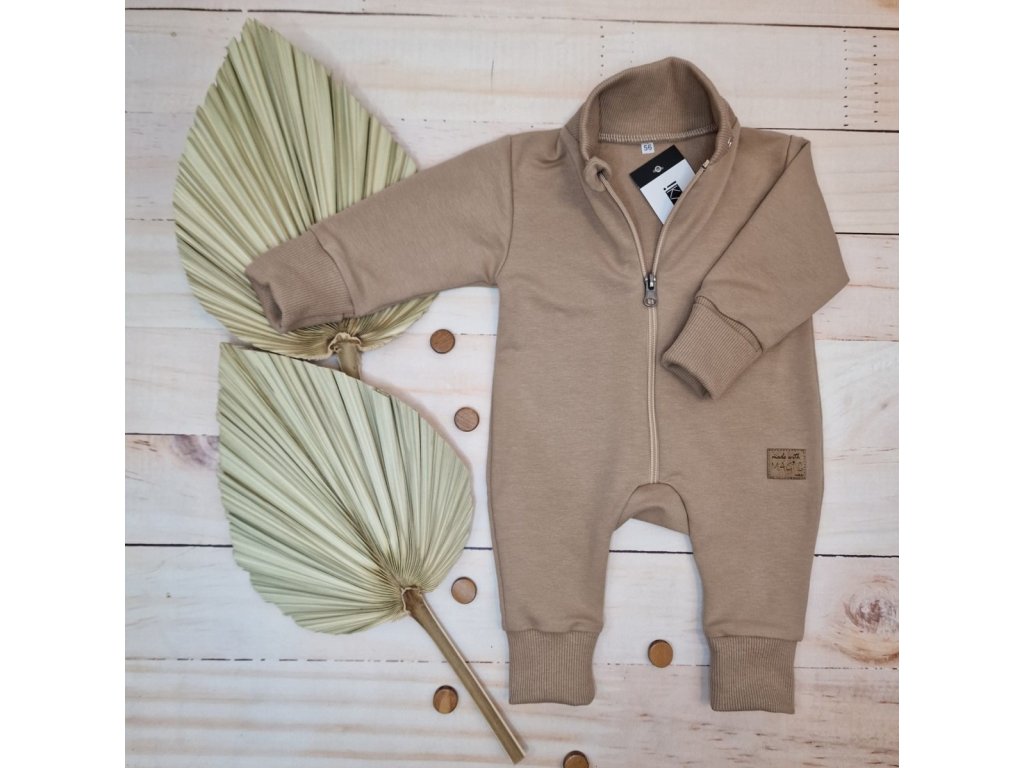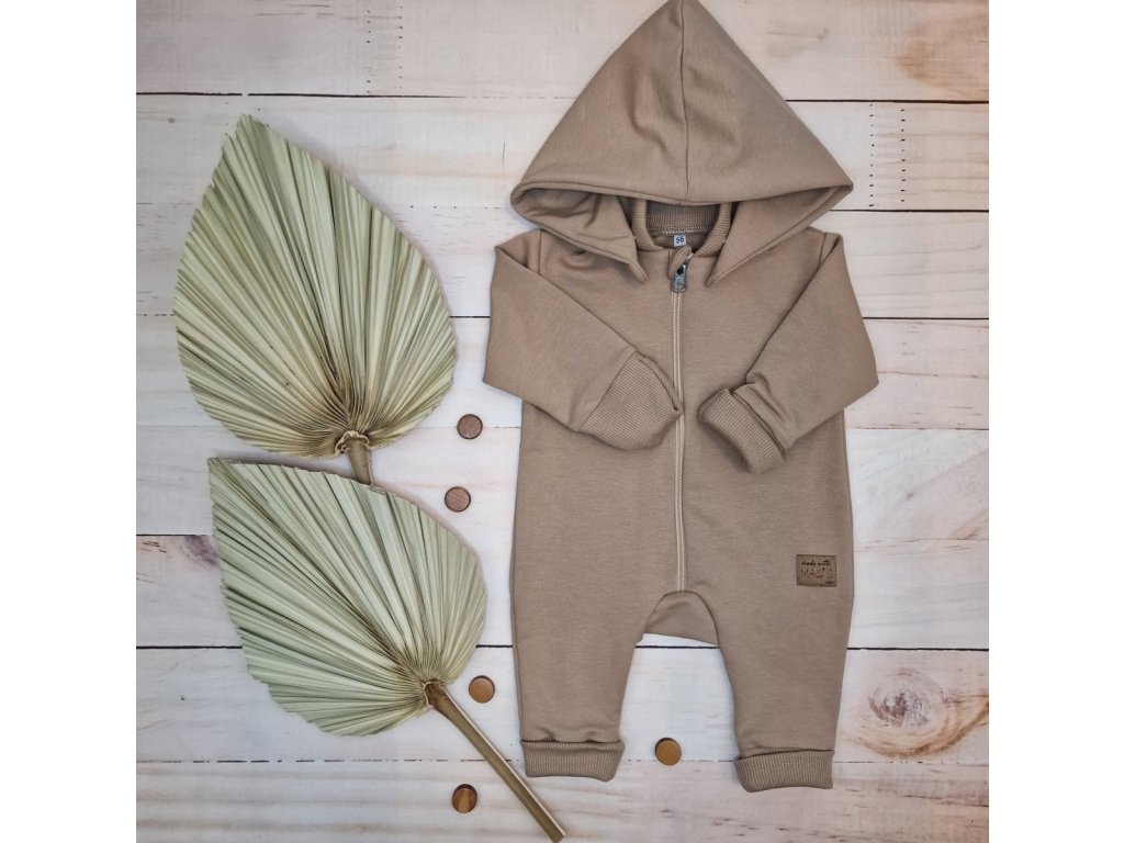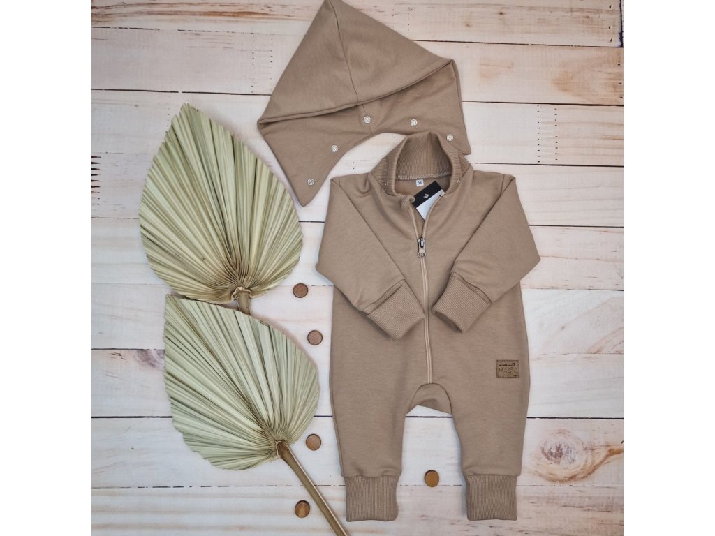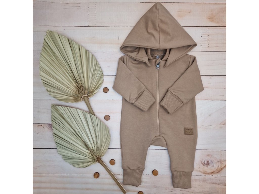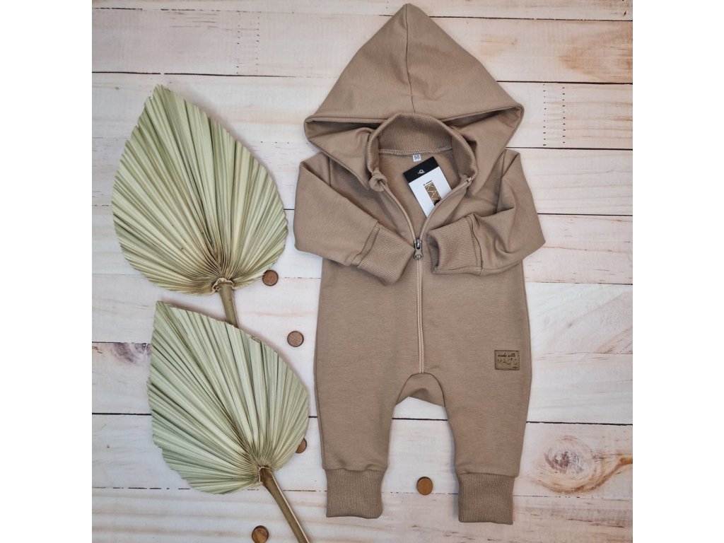Dětský teplákový overal bez šlapek s odepínatelnou kapucí, bavlna, mocca