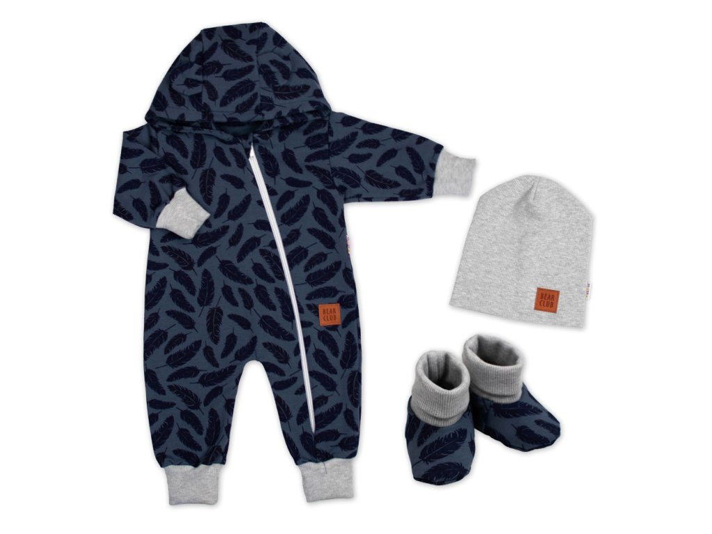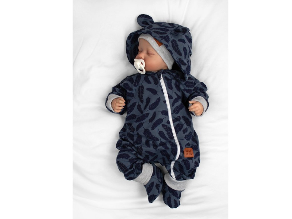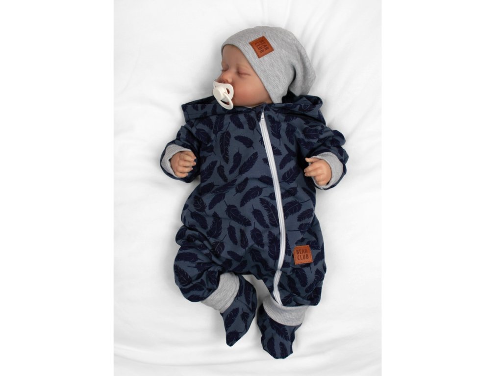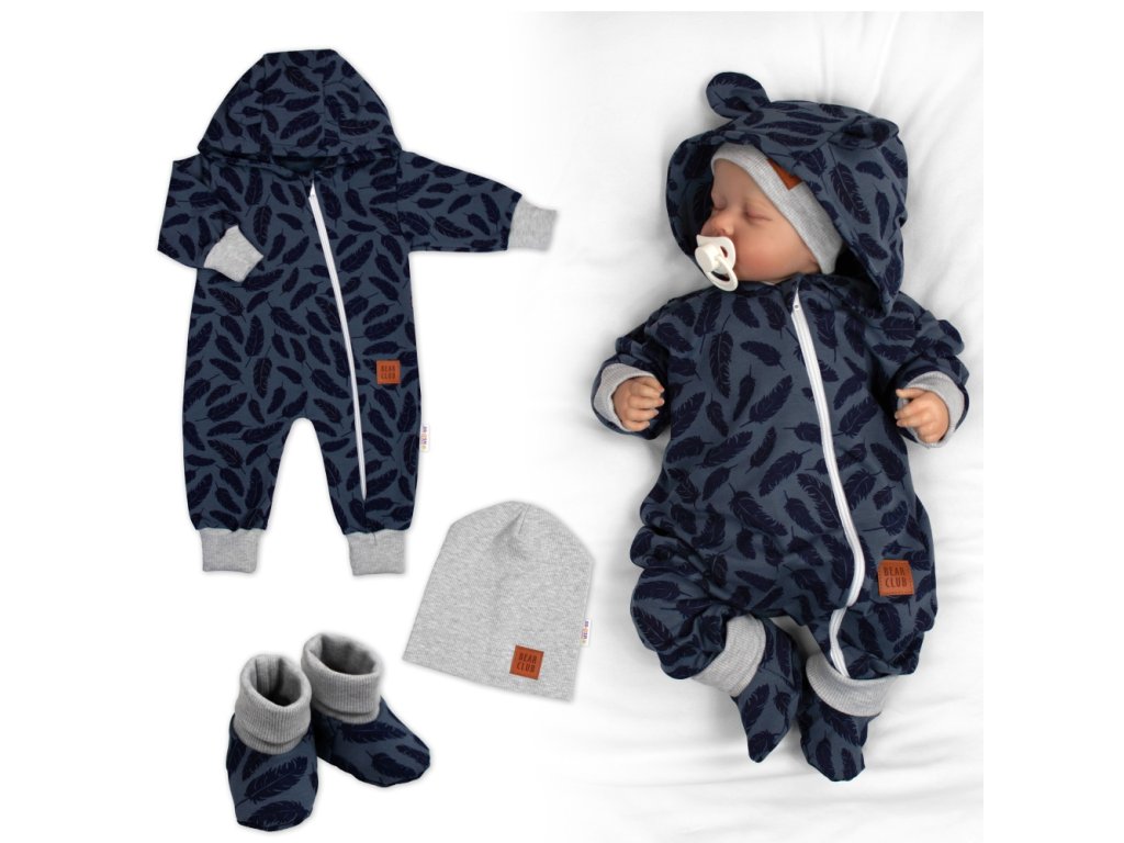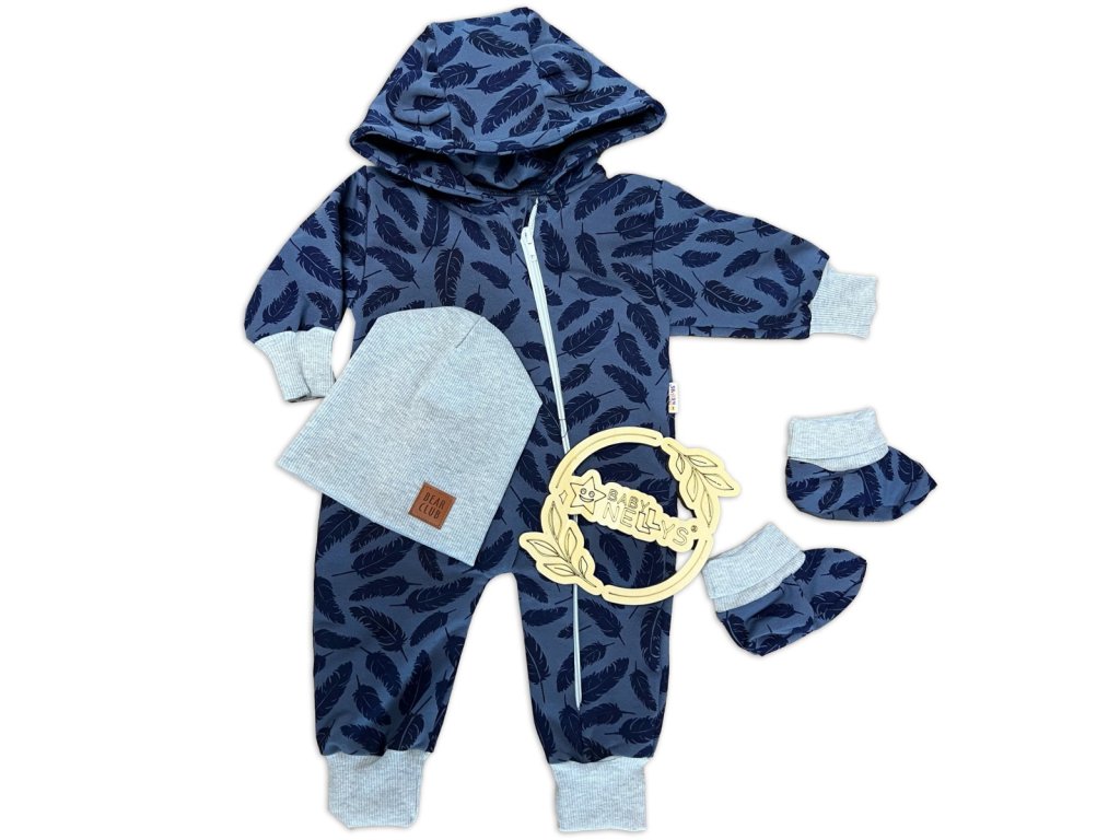 Rostoucí teplákový overal pro miminko, čepice, botky, 3D, Nature - jeans pírka