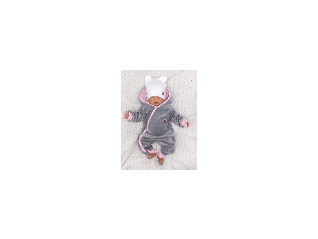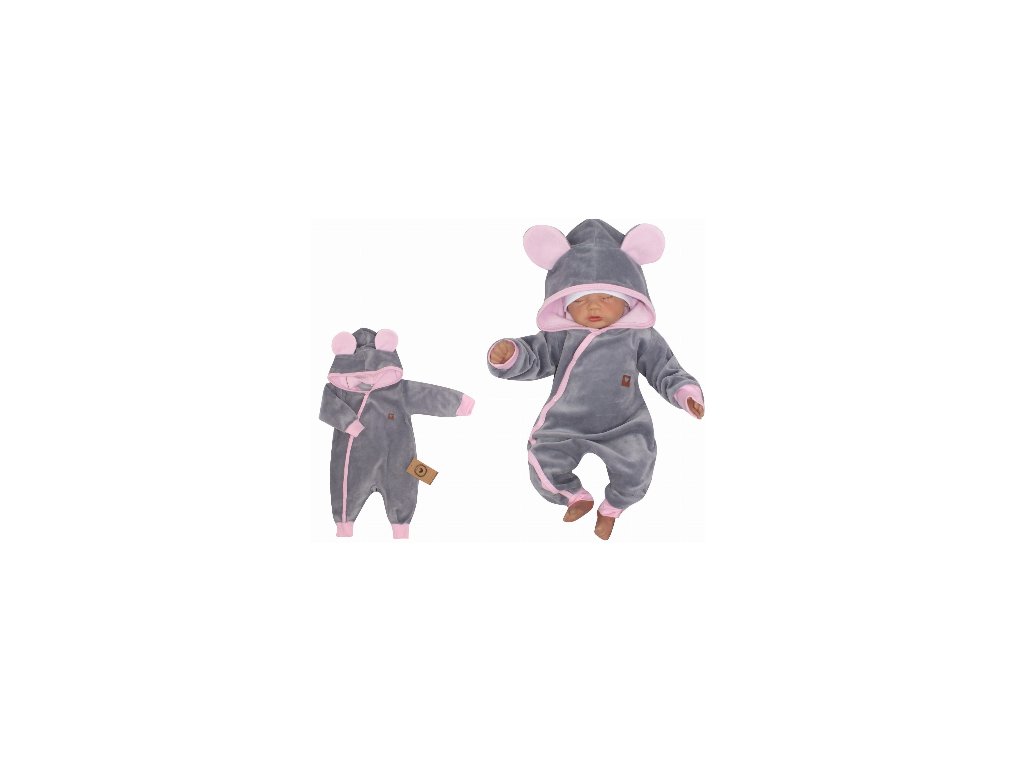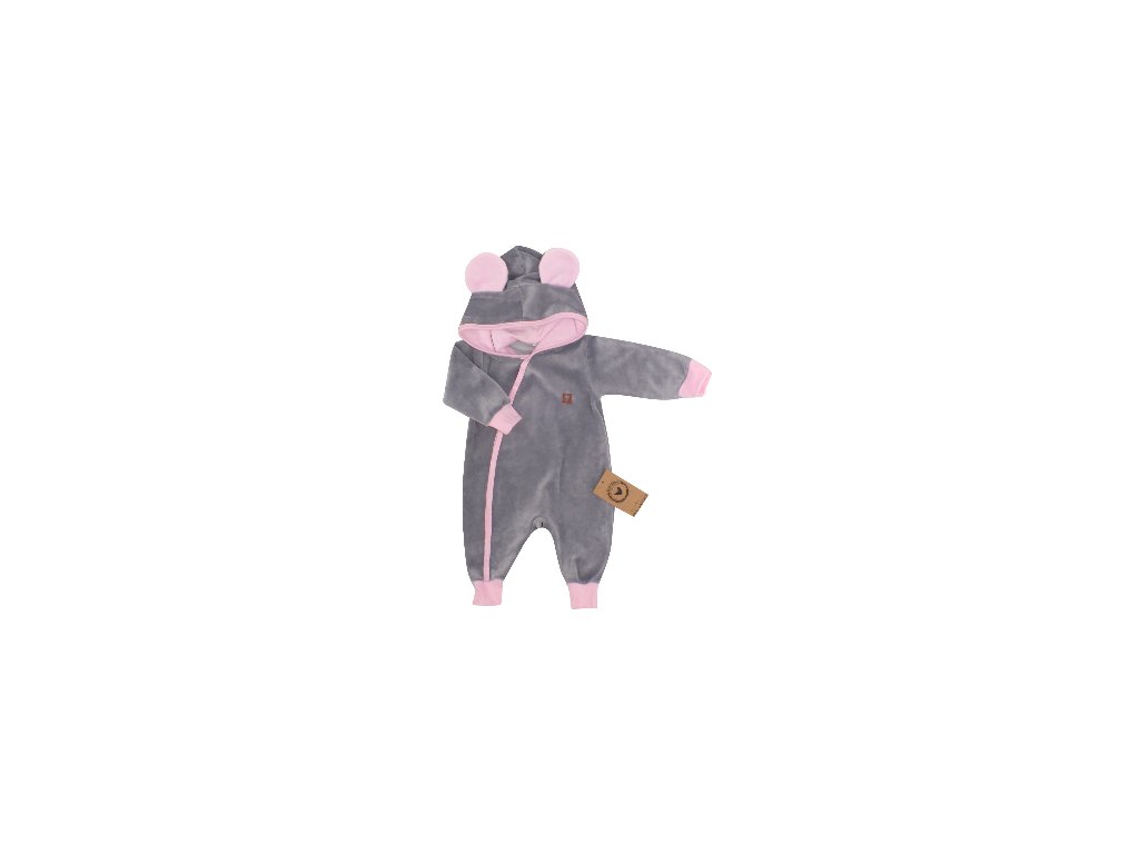 Z&Z Velurový dětský overálek s kapucí a oušky - šedo,růžový