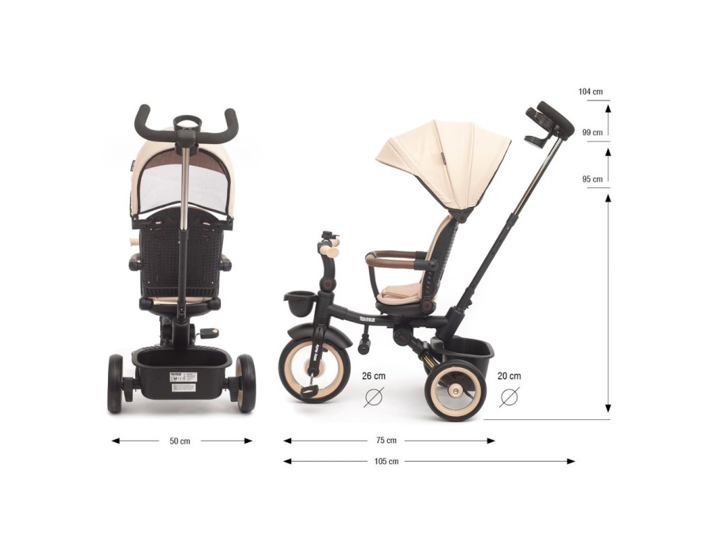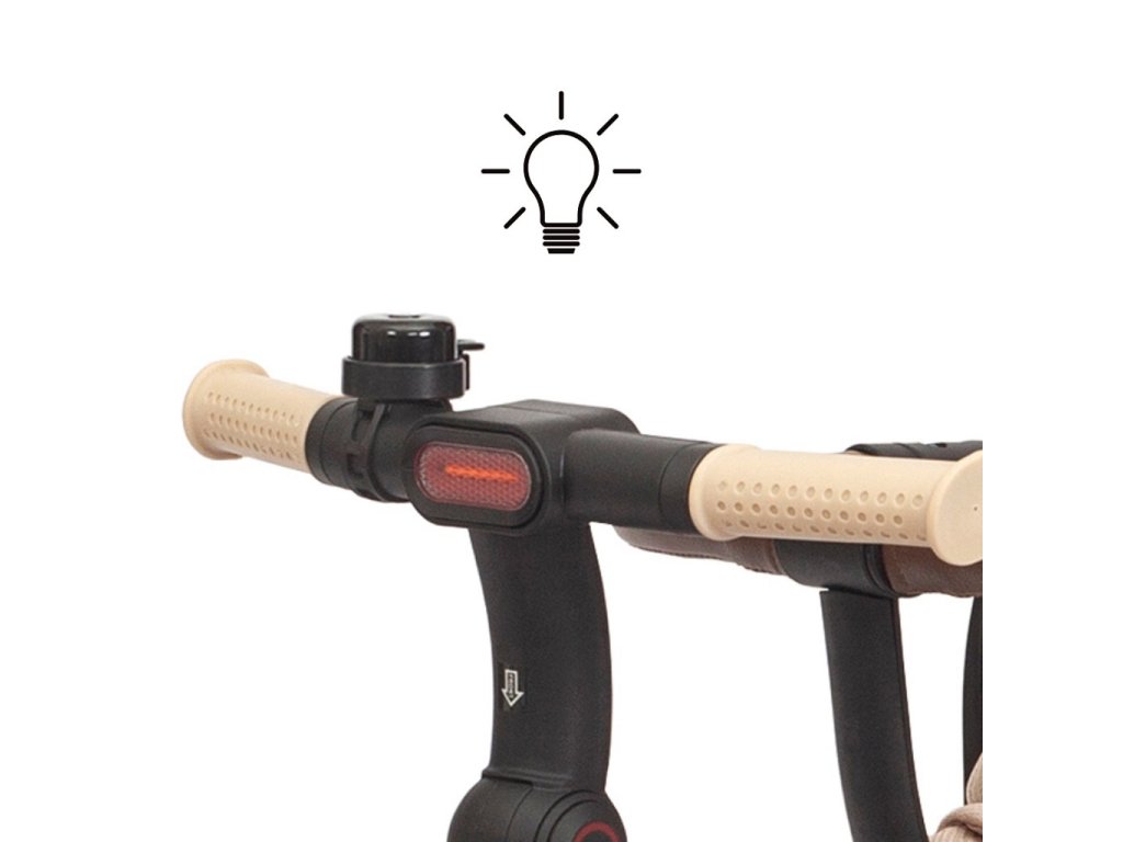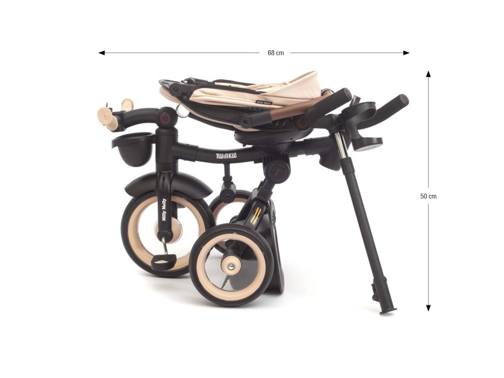 Twinkle je vybavena nastavitelnou rukojetí, funkcí volnoběhu, brzdou, bezpečnostními pásy s chrániči a pohodlným třípolohovým opěradlem a zaručuje úplnou kontrolu a pohodlí pro dítě i rodiče. Její lehký, ale odolný ocelový rám, kola s pěnovou výplní a kuličkovými ložisky, skládací konstrukce a praktické prvky, jako je síťovaná stříška, LED světlo, držák na nápoje a dva úložné boxy, z ní činí perfektní volbu pro každou příležitost – ve městě, na procházce nebo na výletě. Po odstranění rukojeti, kolejnic a stříšky lze Twinkle používat jako klasickou tříkolku.