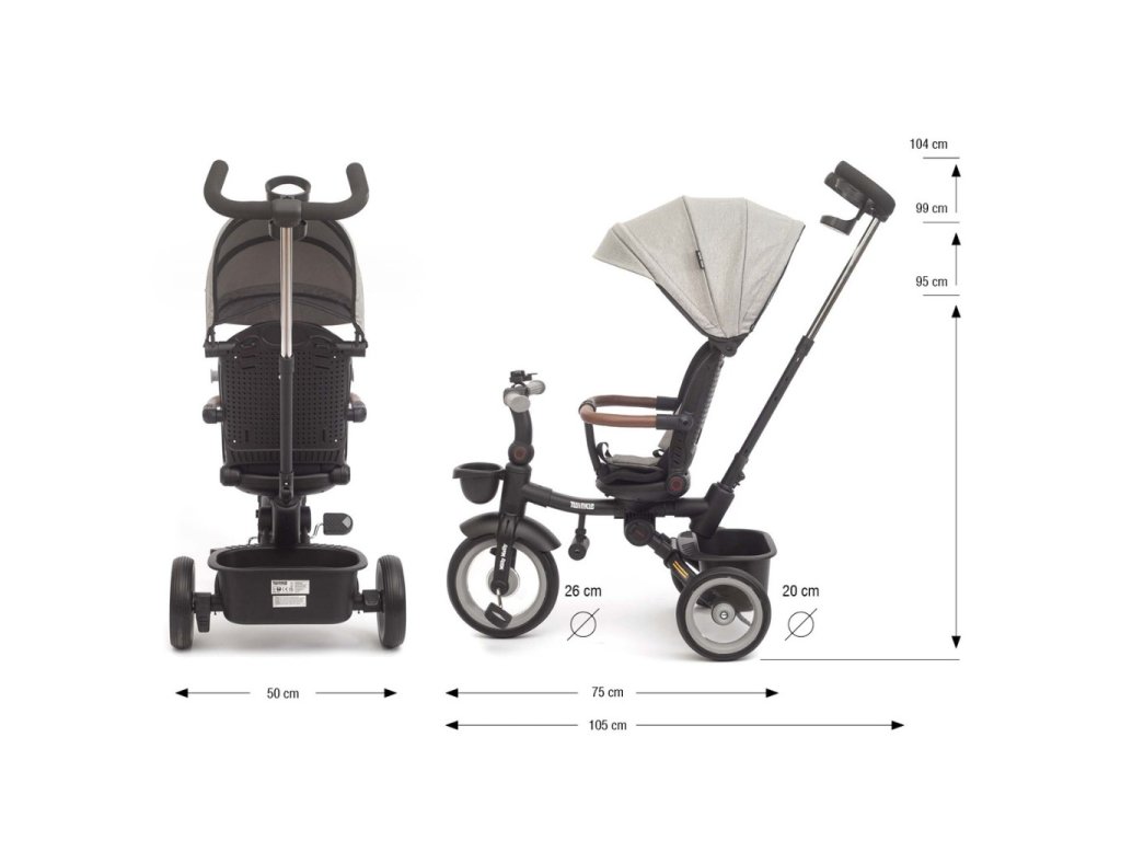 Twinkle je vybavena nastavitelnou rukojetí, funkcí volnoběhu, brzdou, bezpečnostními pásy s chrániči a pohodlným třípolohovým opěradlem a zaručuje úplnou kontrolu a pohodlí pro dítě i rodiče. Její lehký, ale odolný ocelový rám, kola s pěnovou výplní a kuličkovými ložisky, skládací konstrukce a praktické prvky, jako je síťovaná stříška, LED světlo, držák na nápoje a dva úložné boxy, z ní činí perfektní volbu pro každou příležitost – ve městě, na procházce nebo na výletě. Po odstranění rukojeti, kolejnic a stříšky lze Twinkle používat jako klasickou tříkolku.