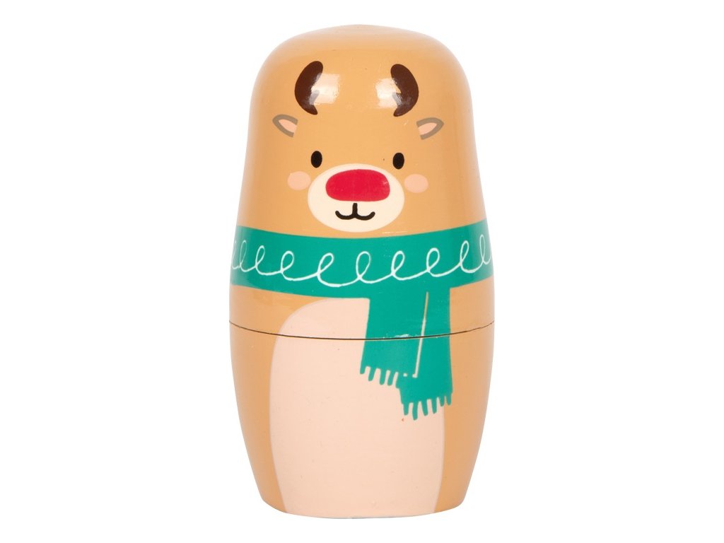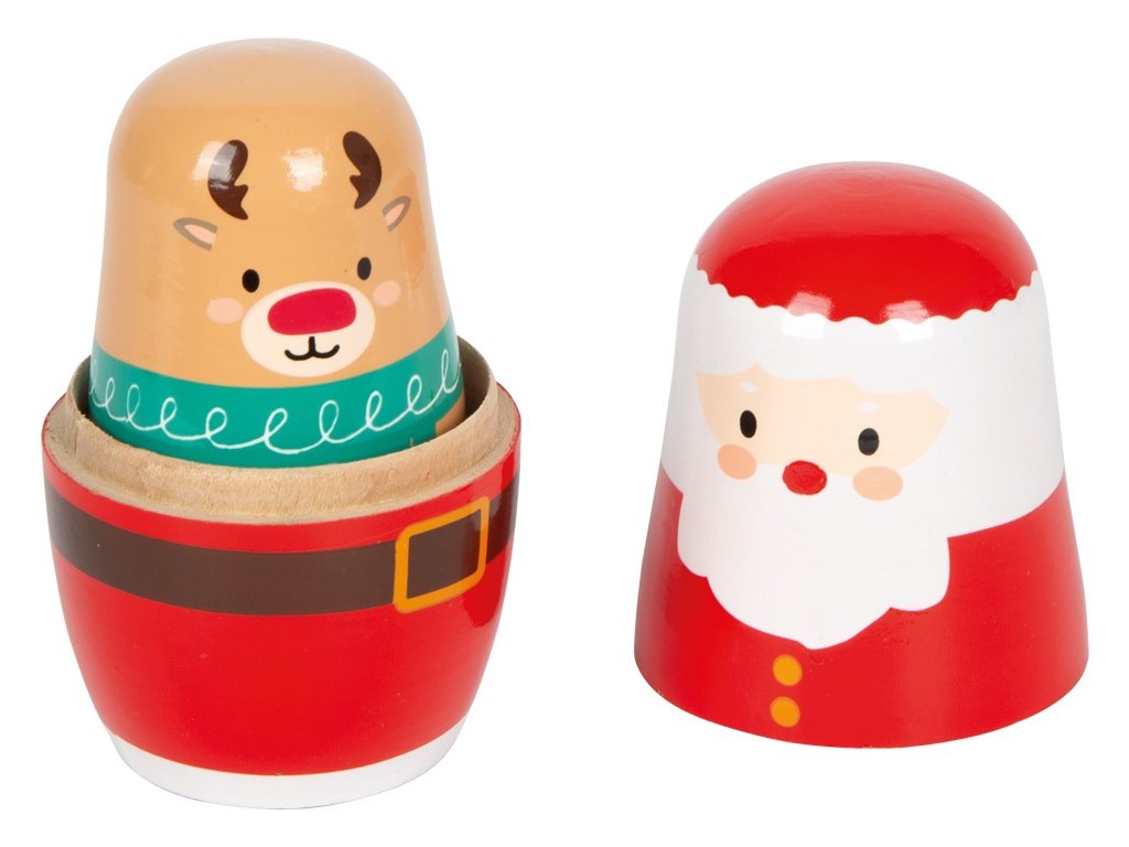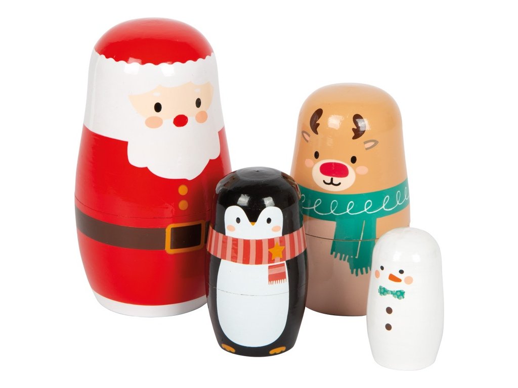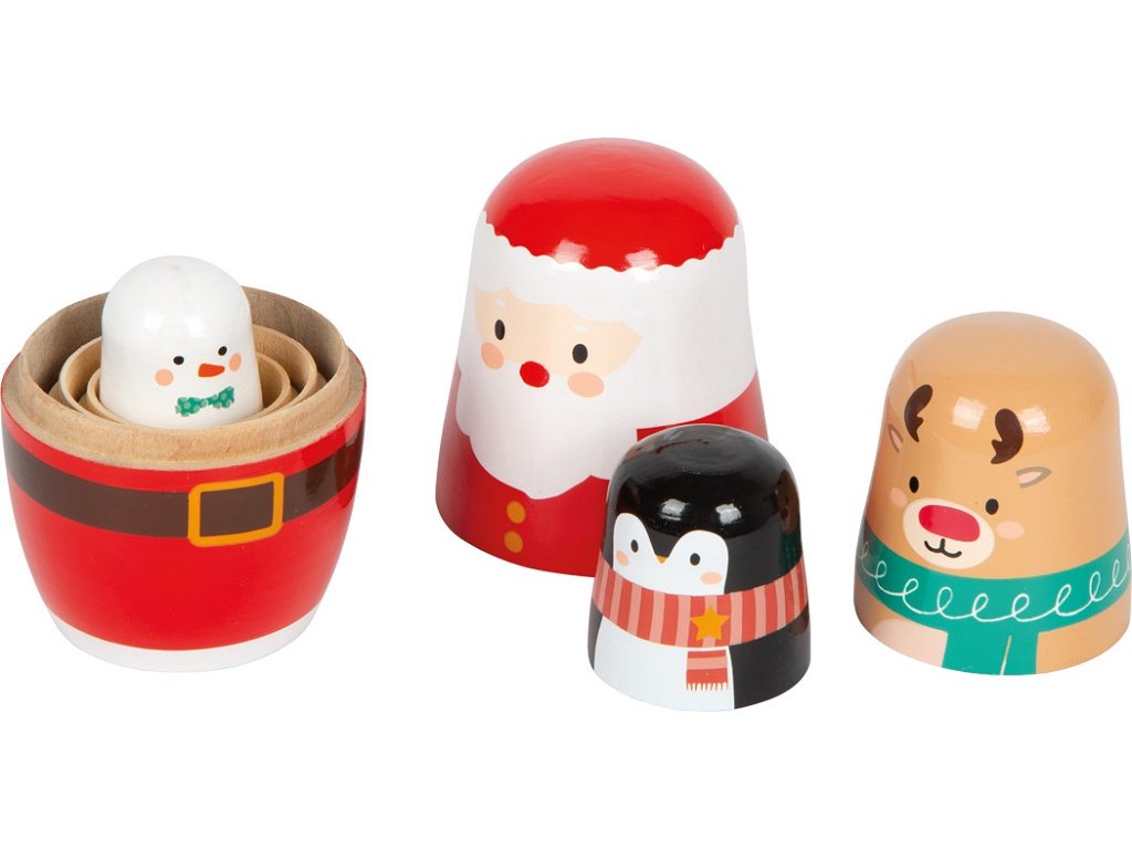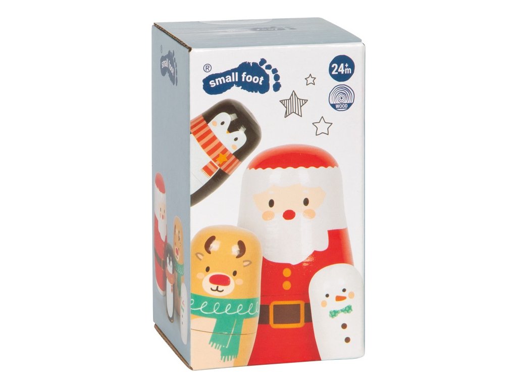 Vánoční matrjošky přinášejí radost dětem i dospělým. Láskyplně malované dřevěné figurky s motivy Santy, soba, tučňáka a sněhuláka. Menší figurky se podle velikosti postupně zasouvají do větších, což podporuje hru, objevování a jemné motorické dovednosti. Každá matrjoška vyzařuje kouzlo Vánoc a tvoří krásnou dekoraci i hračku zároveň. Skvělá aktivita pro rozvoj koordinace ruka-oko a soustředění.