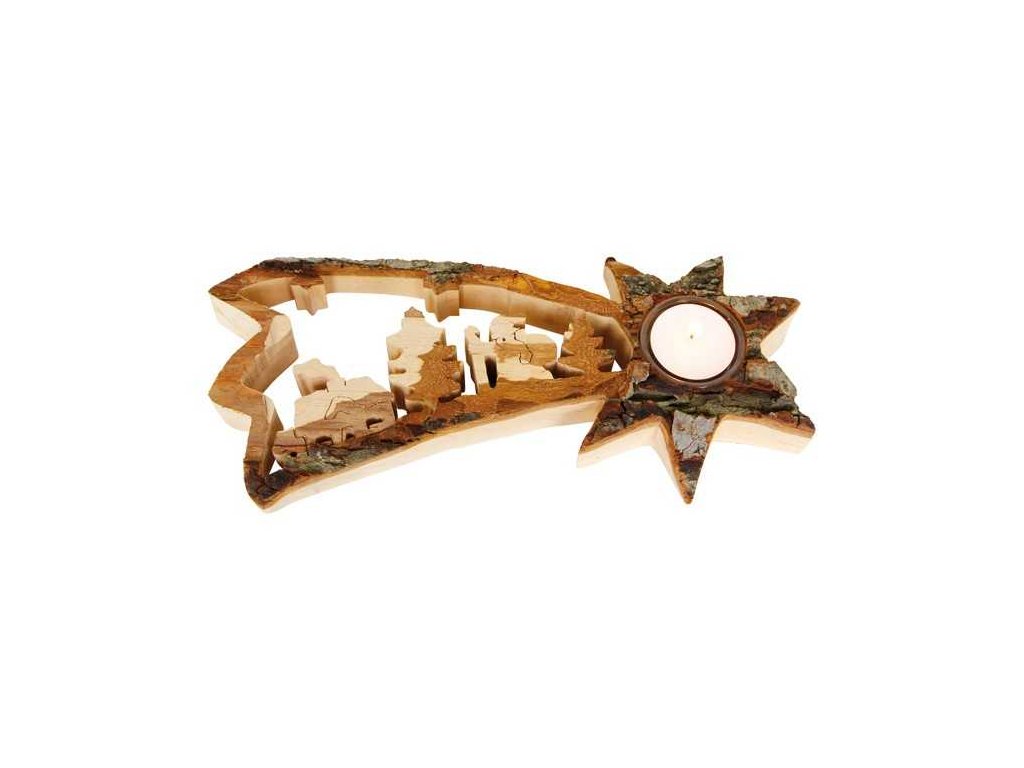 Tento stojan je vyroben z masivního kusu dřeva a zdoben jemně vyříznutým motivem. Vyzařuje jemné světlo.