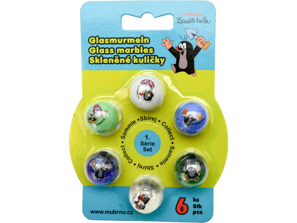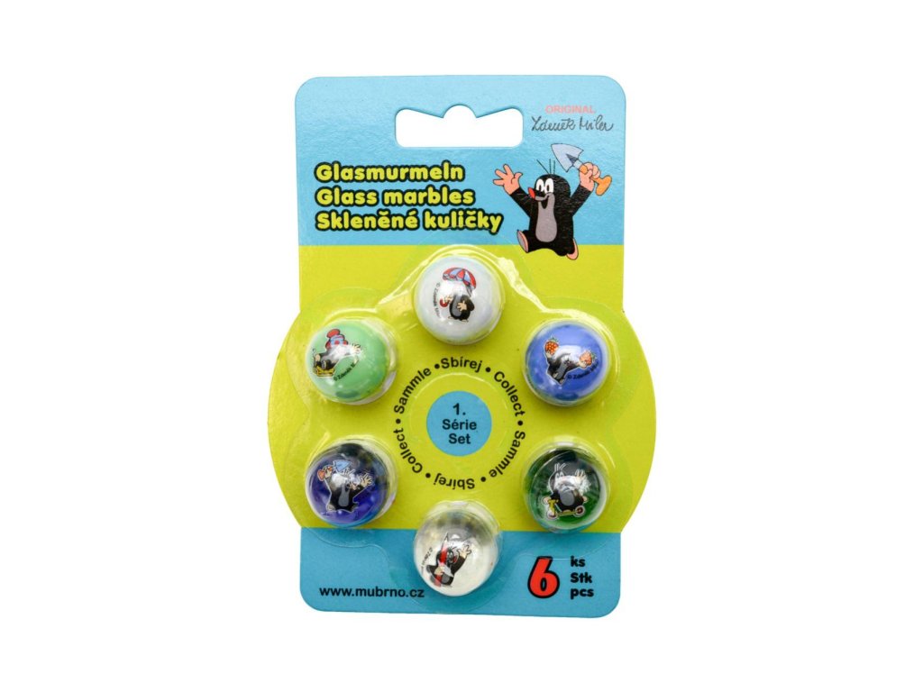Zahrajte si s dětmi venku kuličky a nasbírejte všechny barvy i obrázky! Skleněné kuličky s obrázkem Krtka mají pr.25mm, balené na blistru, 8 různých motivů grafiky, 6 barev skla (3× čiré + 3× matné).Doplňkové parametry