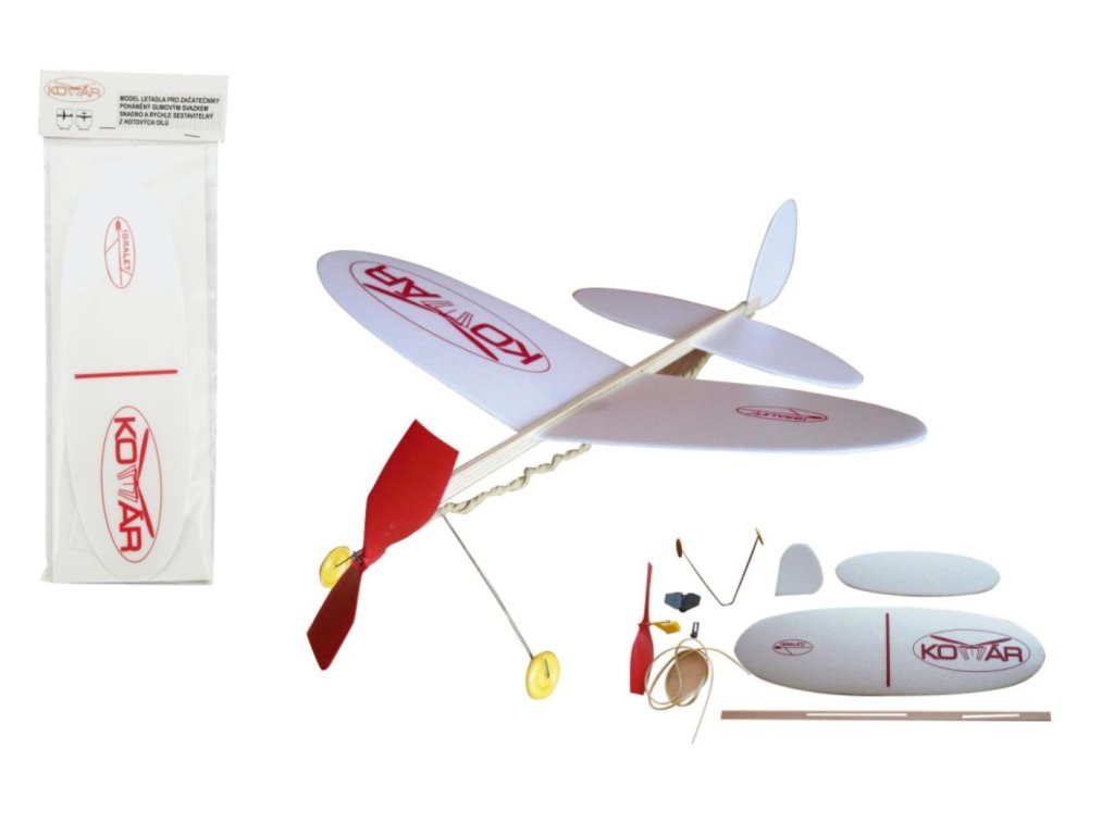 Komár letadélko na gumu Igralet,původní typ,s podvozkem,polystyrenové křídlo.Model Letadla pro začátečníky poháněný gumovým svazkem snadno a rychle sestavitelný z hotových dílů. Délka 38 cm, rozpětí 31 cm.