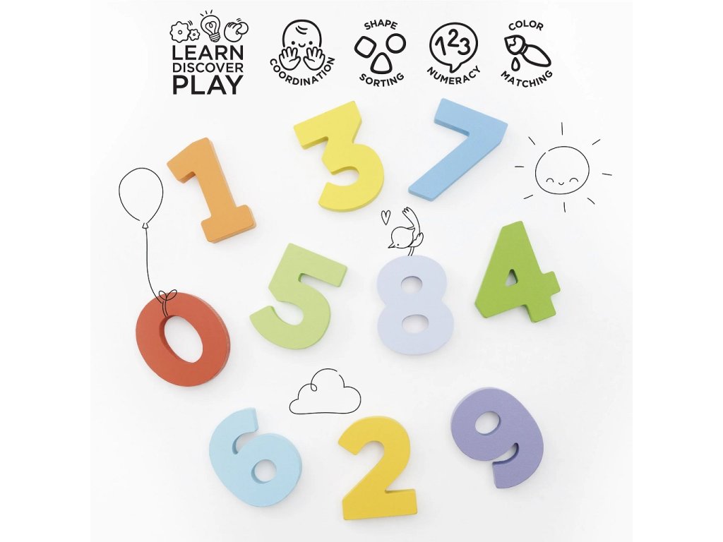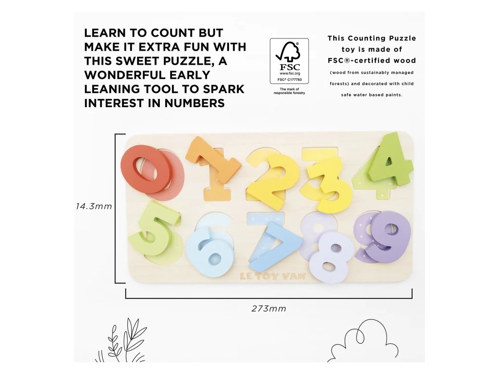 Naučte se počítat! Udělejte to hravě a ještě zábavněji s vkládacím puzzle! Jednoduše umístěte dílky na svá místa či koukejte po tečkách na základní desce a počítejte za pochodu. Toto puzzle je skvělým pomocníkem pro rané učení, které podnítí zájem o čísla. Obsahuje odolné robustní kusy od 1 do 9. Perfektní dárek pro malé chytré hlavičky! Vkládací puzzle je vyrobeno ze dřeva s certifikací FSC® (dřevo z lesů obhospodařovaných udržitelným způsobem) a ozdobeno barvami na vodní bázi bezpečnými pro děti. Hračky s účelemVšechny hračky firmy Le Toy Van jsou vyrobeny s cílem – aby dlouho vydržely. Designovány s láskou zkušenými řemeslníky za použití etických praktik a udržitelných materiálů, které jsou laskavější k naší planetě. Hlavní vlastnosti: vyrobeno eticky z udržitelného dřevatestováno dle nejpřísnějších standardůmalováno netoxickými barvami na bázi vodyobsahuje základnu a 10 čísel Ocenění hračky: Right Start Toy Award 2023 Petilou kolekce: Kolekce pro nemluvňata a batolata od Le Toy Van obsahuje hlavně hmatové hračky, které mají nejmenším posloužit také jako učební prostředky. Kolekce je inspirována přírodou kolem nás a je navržena tak, aby rozvíjela smysly dětí pomocí rozdílných zvuků, textur, tvarů a hmotností. Děti tak od malička zapojí všechny své smysly. V kolekci najdete například skládačky, vkládačky, chodítka, … Značka a certifikát FSC® (Forest Stewardship Council) zaručuje, že dřevo, ze kterého byl produkt vyroben, nebylo vytěženo nelegálně a pochází z lesů obhospodařovaných šetrným či přírodě blízkým způsobem, ve kterém jsou dodržovány přísné environmentální a sociální požadavky. Značka FSC® na výrobku znamená, že svým nákupem pomáháte chránit lesy a podporujete šetrné, odpovědné či přírodě blízké hospodaření, díky kterému jsou naše lesy stabilnější, zdravější, mají přirozenou druhovou skladbu a lépe odolávají negativním následkům klimatických změn.Doplňkové parametry