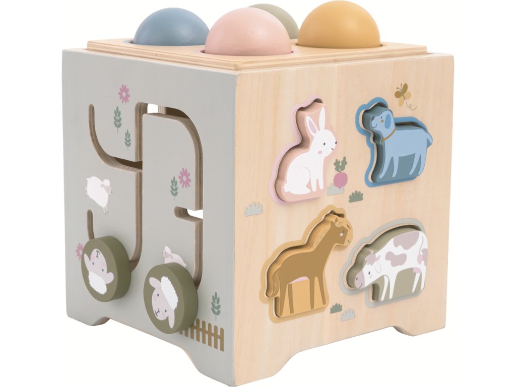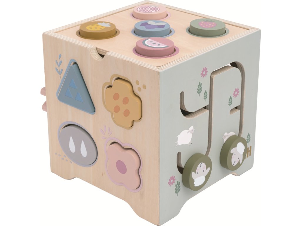 Objevujte svět a učte se zábavnou formou! Dřevěná motorická kostka s motivy farmy nabízí dětem pestrou škálu herních aktivit, které rozvíjejí jemnou motoriku, logické myšlení i koordinaci ruka-oko. Každá strana kostky přináší jinou zábavnou výzvu – od vkládání zvířátek, přes otáčení ozubenými kolečky, až po barevné vkládačky nebo jednoduché počítání. Hračka navíc obsahuje vyměnitelná víka s různými herními možnostmi. Děti mohou například přiřazovat obrázková kolečka ke správným předlohám a tím trénovat zrakové vnímání, třídění a soustředění. Nechybí ani oblíbená zatloukací hra, při které lze zatloukat dřevěné mrkvičky nebo kuličky. Během hry se děti učí rozpoznávat základní tvary, barvy i zvířátka. Veškeré díly lze uložit uvnitř kostky, takže po hraní zůstává vše pohromadě a nic se neztratí. Díky jemným pastelovým barvám a roztomilým ilustracím zvířátek je hračka nejen atraktivní a zábavná, ale je i pěkným doplňkem dětského pokojíčku či herny.