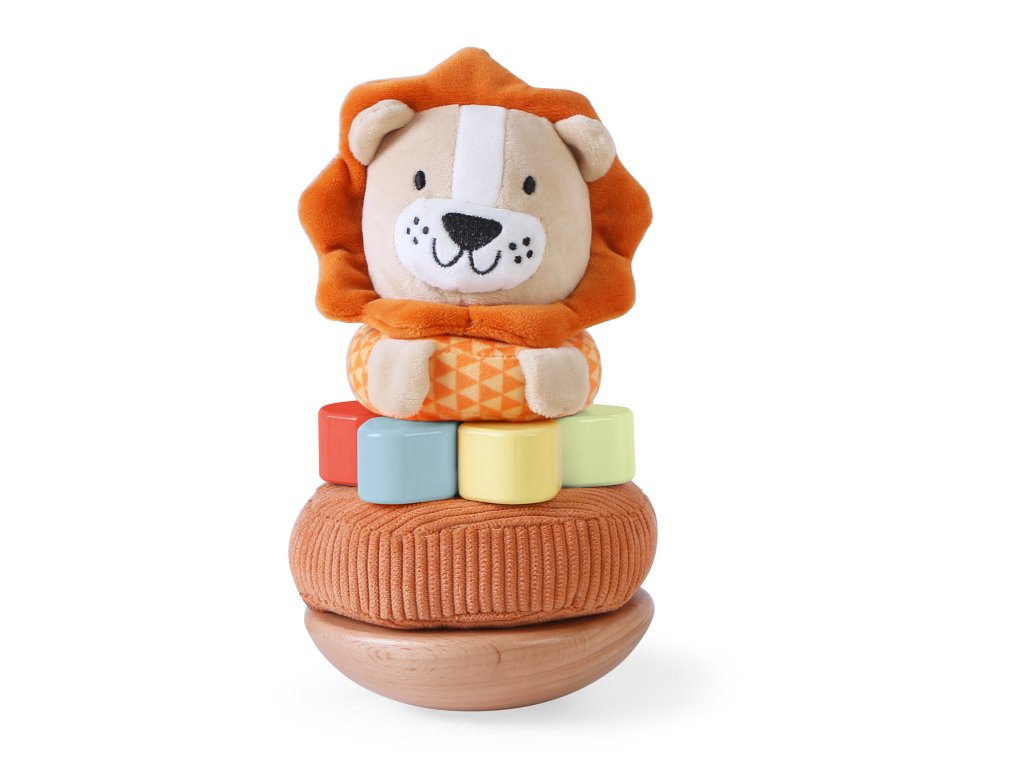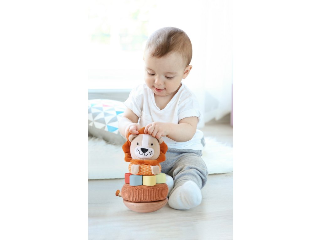 Lvíček zve děti ke hře plné barev, tvarů a objevování! Na dřevěnou tyčku, která tvoří tělo lvíčka, se postupně nasazují kroužky o více velikostech z různých materiálů i textur. Nejdřív látkový kroužek s ocáskem a nakonec plyšová hlavička lvíčka. Dokážete to nasadit správně, aby byl lvíček kompletní? Skládání rozvíjí jemnou motoriku, koordinaci ruka-oko i schopnost rozlišovat tvary, textury a velikosti.