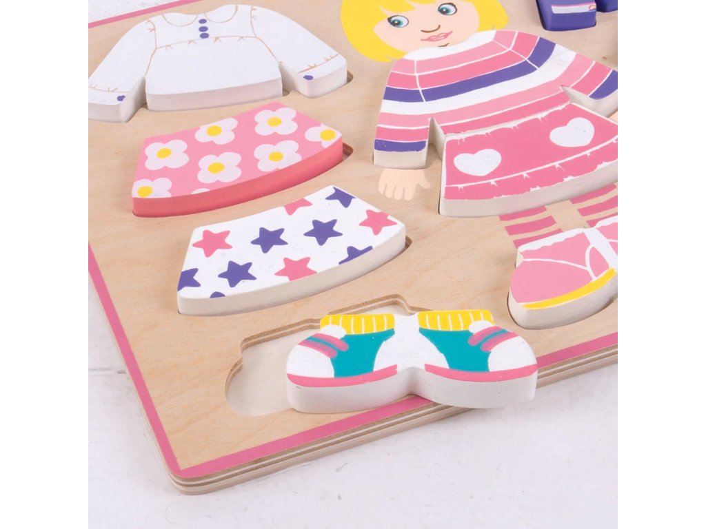 Tento komplet s deseti výměnnými díly si vaše deti určitě zamilují. S touto nádherně zábavnou Dressing Girl Puzzle můžou zaměňovat oblečení, jak jim to jejich představivost dovolí. Každý kus je velmi pestře zbarvený a jednoduchý pro práci malých prstíků vašeho dítěte. Pro toto vkládací puzzle je charakteristická tloušťka použitého materiálu - dřeva 2 cm. Dětem to zjednodušuje úchop dílků a bezpečnost hračky.
