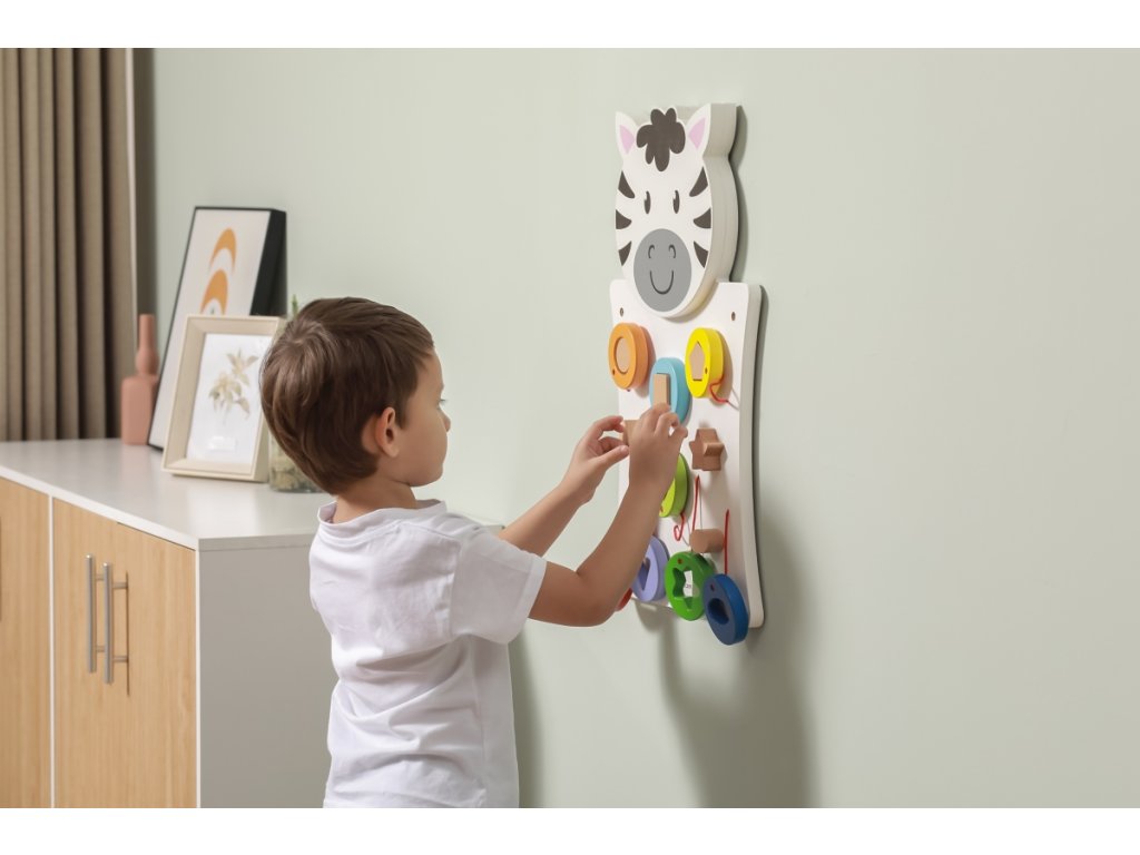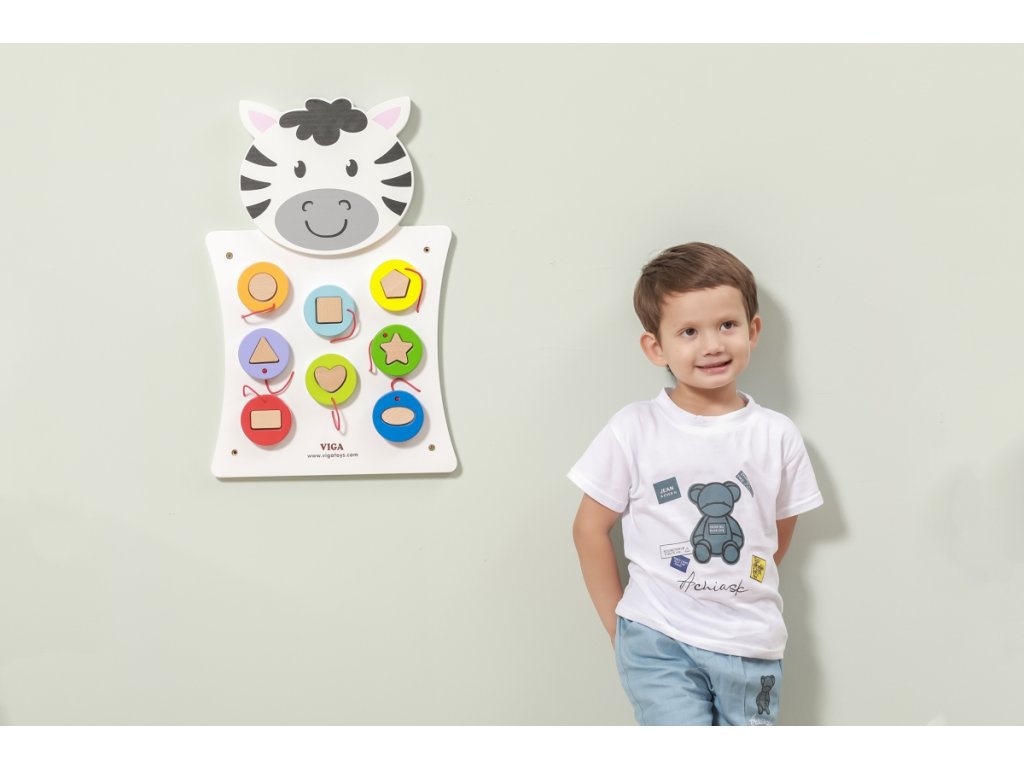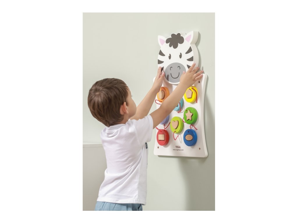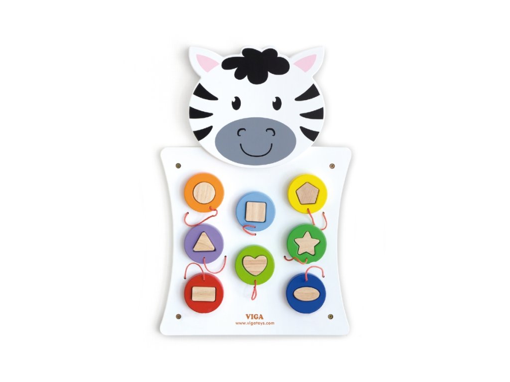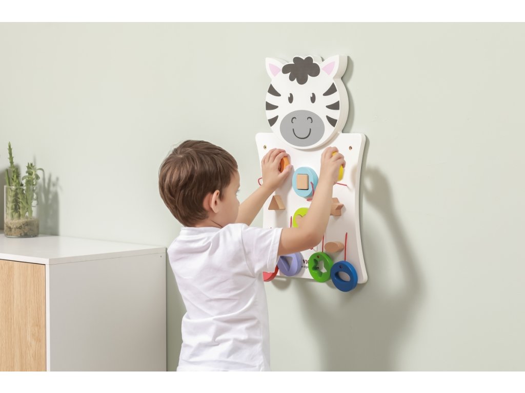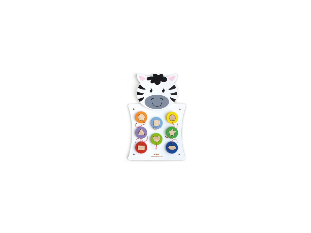 Dřevěná nástěnná hra s motivem zebry. Velikost cca 36 x 55 x 3,5 cm. Hra pro výuku barev a tvarů. Rozměry balení cca 38,5 x 57 x 4,5 cm. Věk 18m+Doplňkové parametry