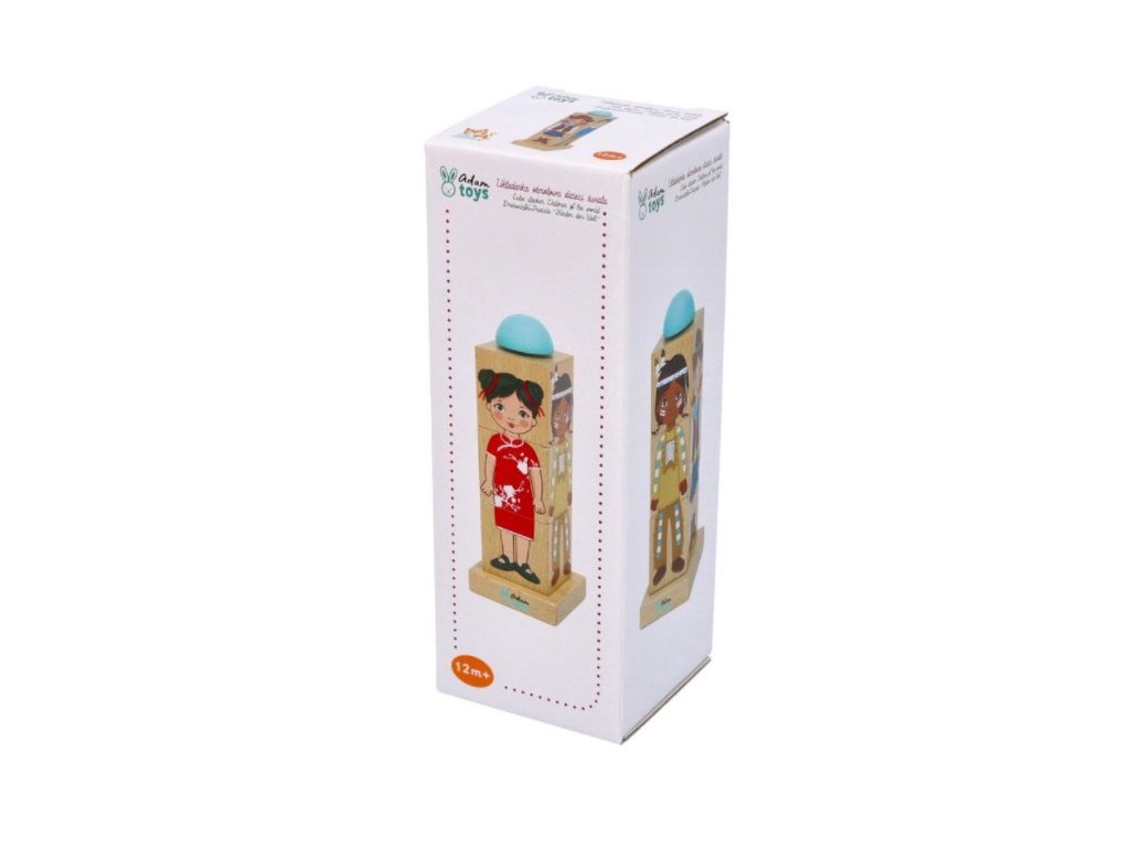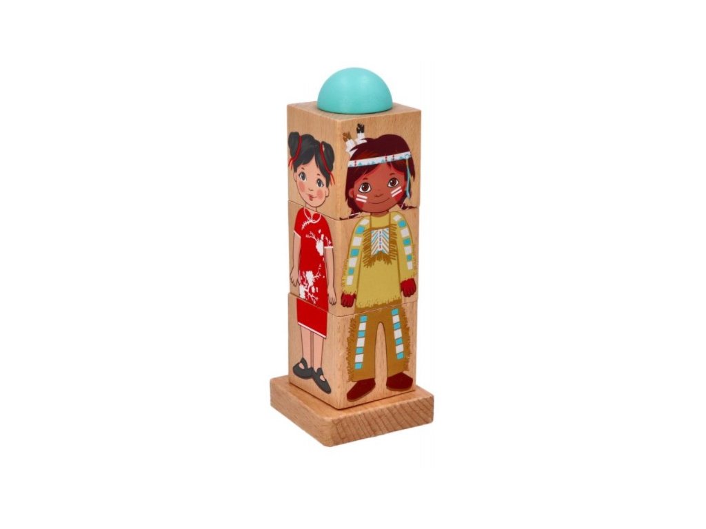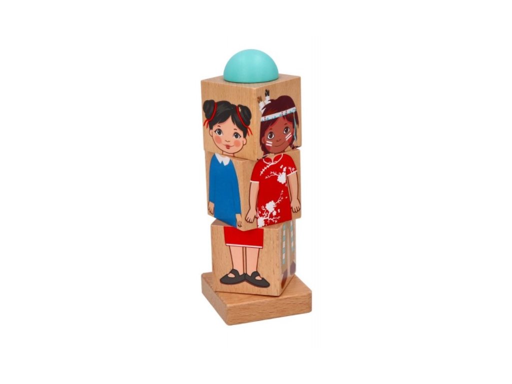 Zde je stojící hračka se třemi krychlovými bloky na kůlu. Bloky lze libovolně otáčet a vytvořit tak čtyři postavy představující děti žijící v různých oblastech světa.Máme obyvatele: