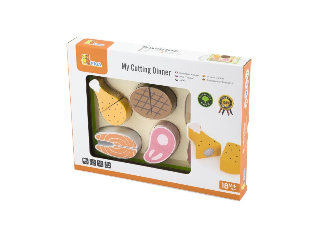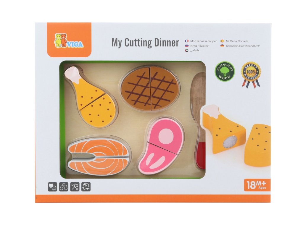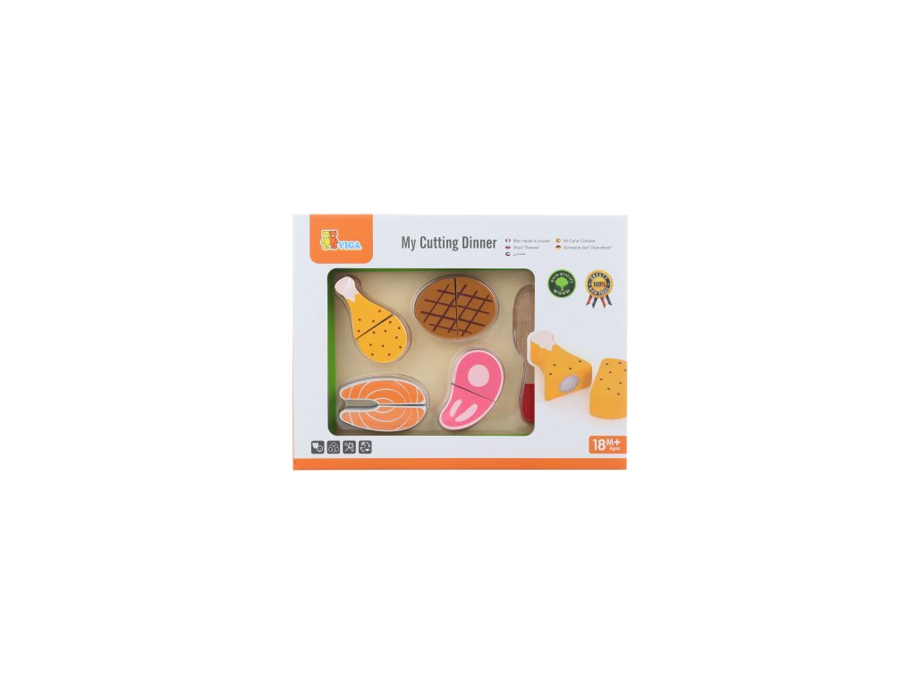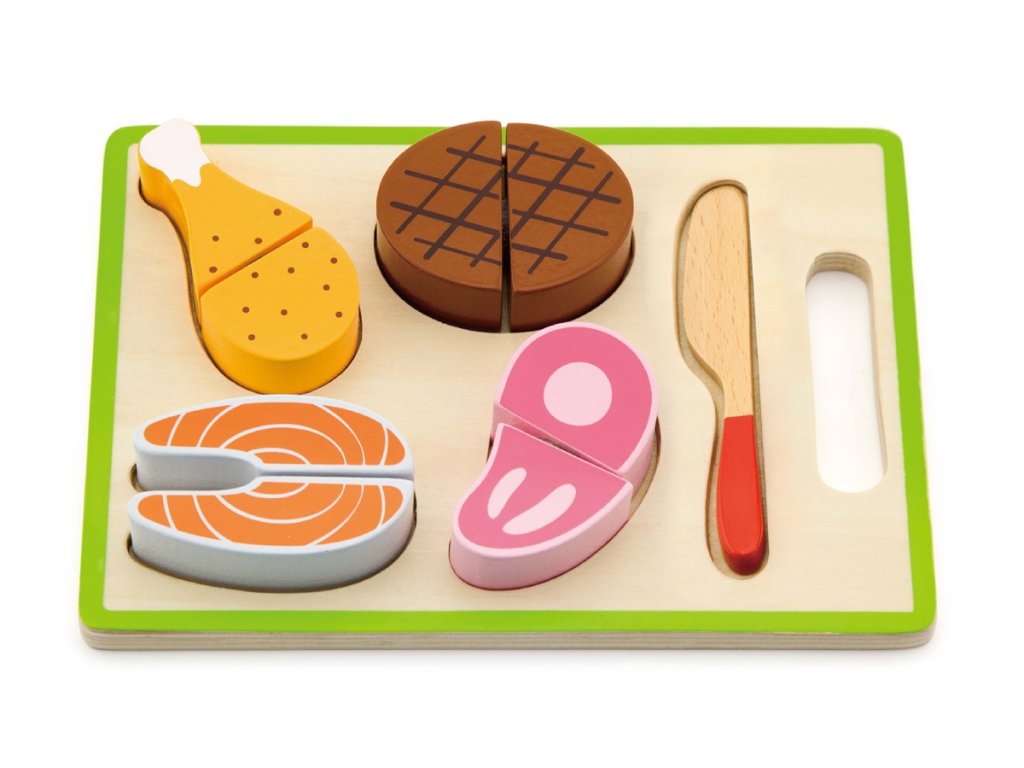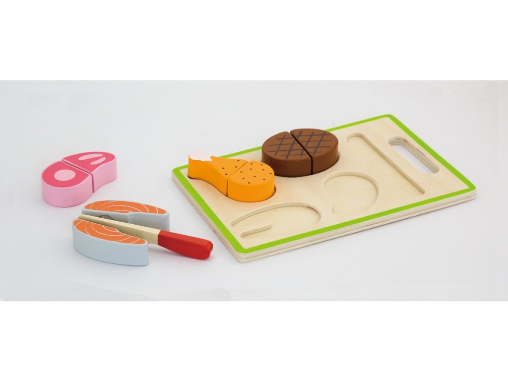 Dřevěné krájení masa. Balení obsahuje 4 druhy masa, prkénko a nůž. Rozměry balení cca 27,5 x 21 x 3,5 cm. Věk 18m+Doplňkové parametry