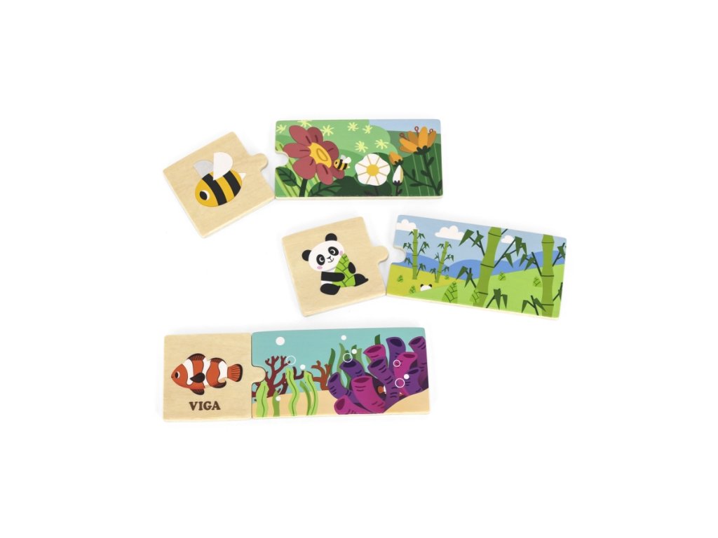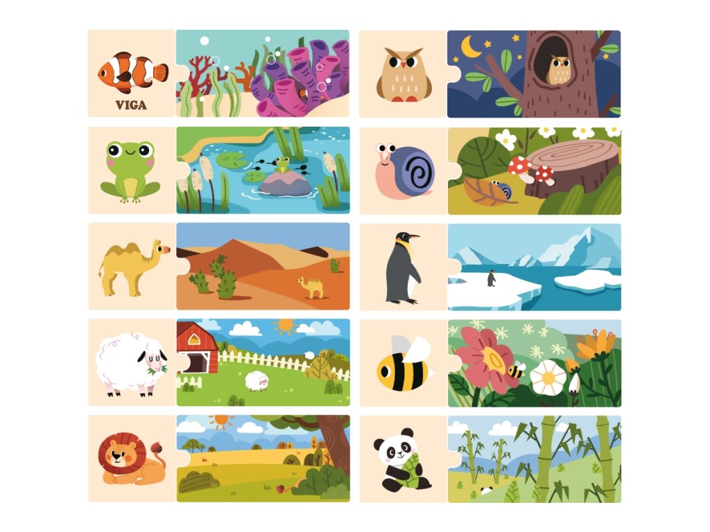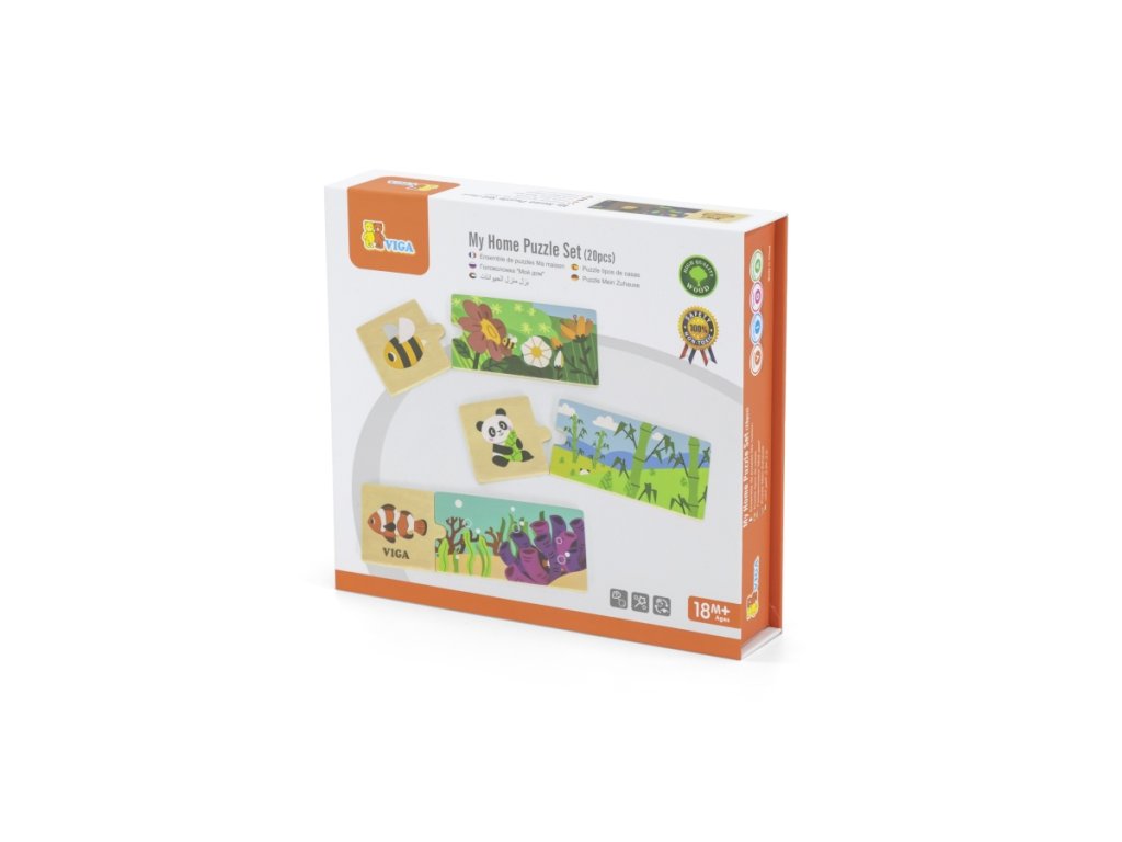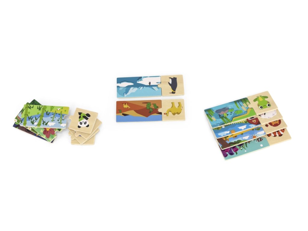 Sada se skládá z 20 prvků, které je třeba nakombinovat tak, aby bylo zvíře přiřazeno ke svému přirozenému prostředí. Prvky jsou velmi dobře sladěné a mají barevné obrázky. Obsahuje 20 dílků. Rozměr balení cca 21 x 19 x 4,5 cm. Věk 18m+Doplňkové parametry