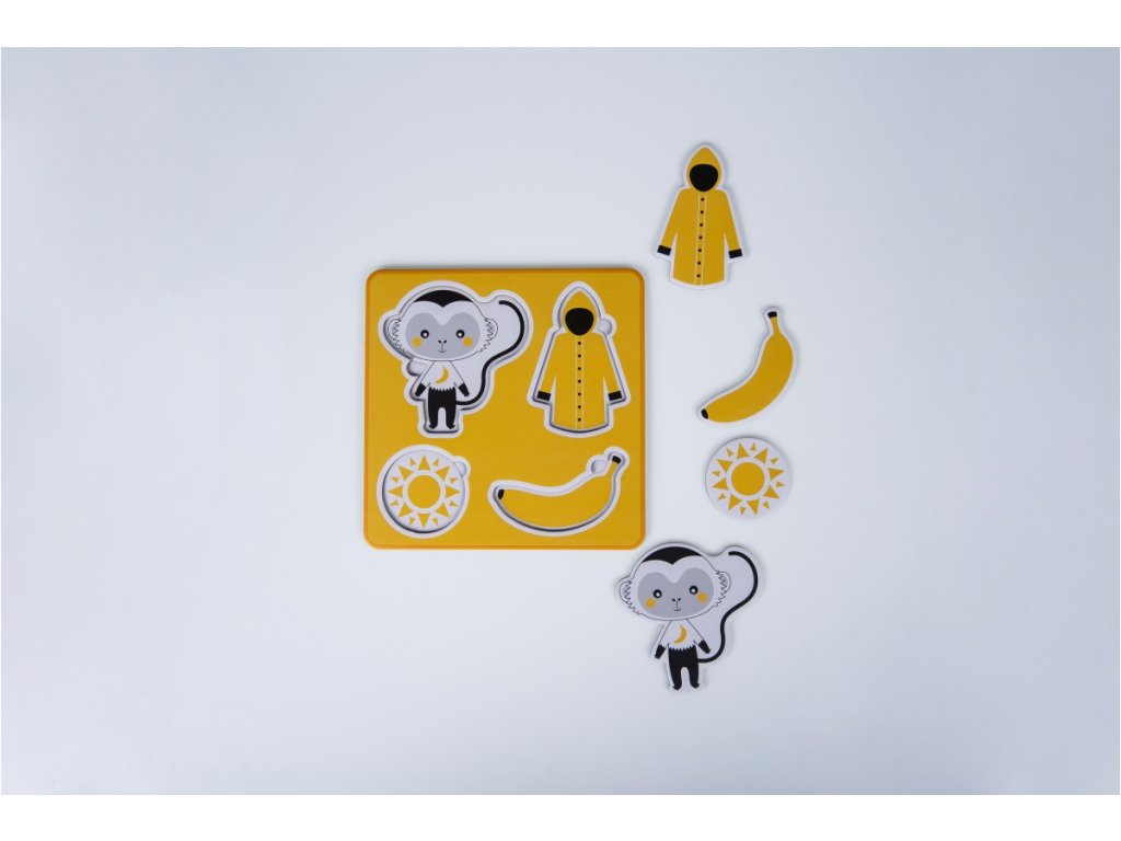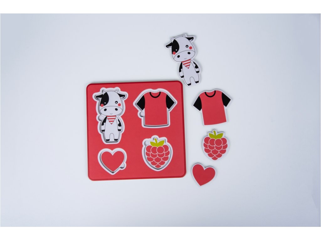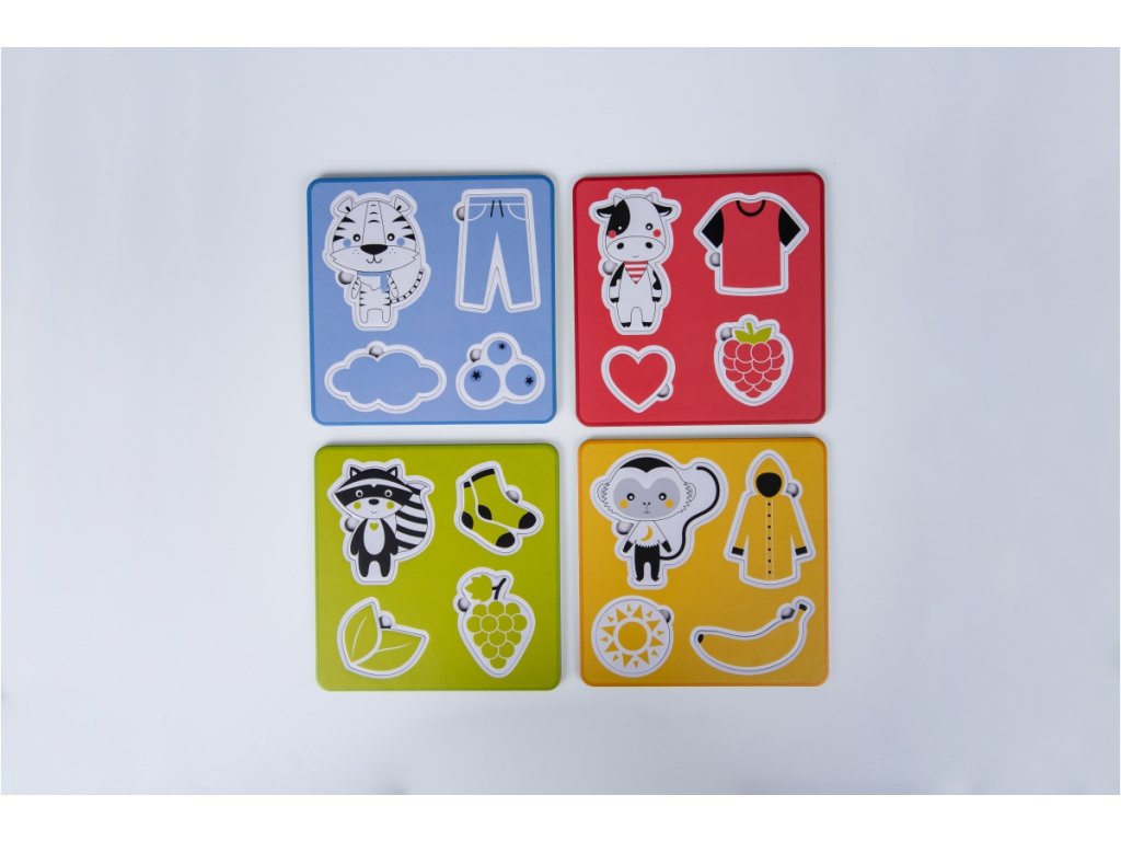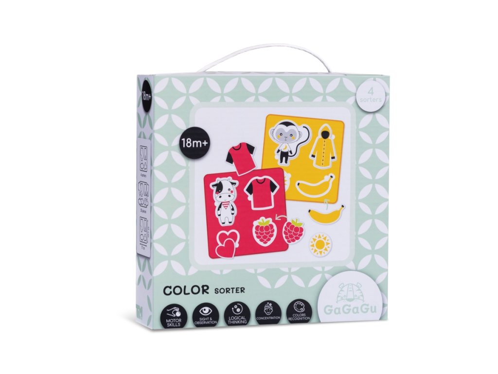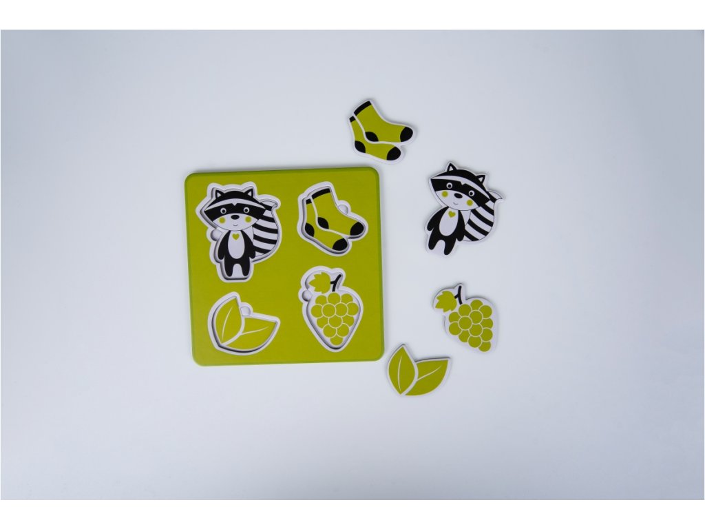 Sada obsahuje 4 desky ve 4 různých barvách, každá s jinou úrovní obtížnosti. Díky malým prohlubním je odstraňování jednotlivých prvků mnohem snazší. Obrázky zobrazují zvířátka GaGaGu a co nejčastěji jedí. Různé barvy a tvary usnadňují dítěti nalezení dílů pro příslušné puzzle. Puzzle stimulují manuální zručnost, soustředění a zrakové vnímání. Věk 18m+Doplňkové parametry
