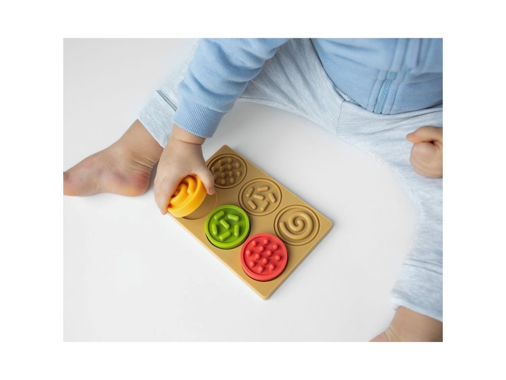 Sada se skládá z měkké a bezpečné hrací desky se šesti různými tvary a odpovídajícími otvory se třemi různými tvary a odpovídajícími otvory a tří senzorických kol. Hra spočívá v přiřazování koleček k příslušným místům na desce, což umožňuje vašemu dítěti prozkoumávat různé struktury hmatem.