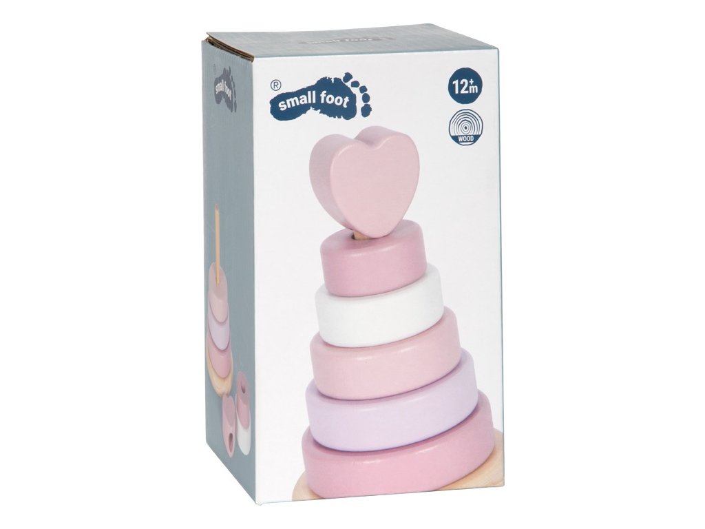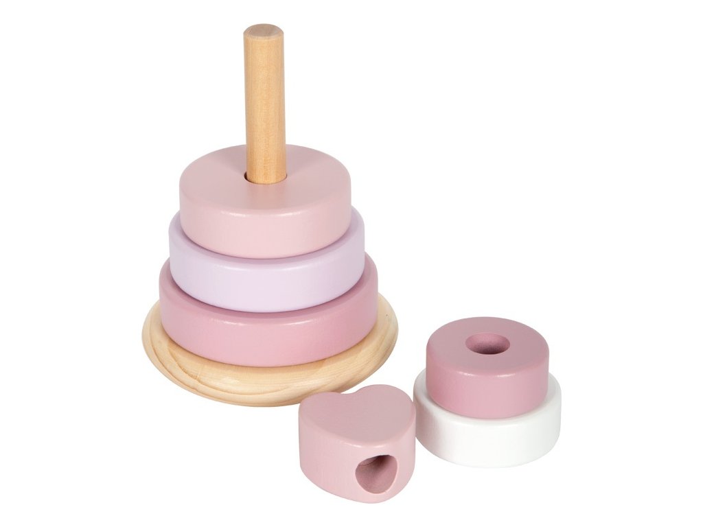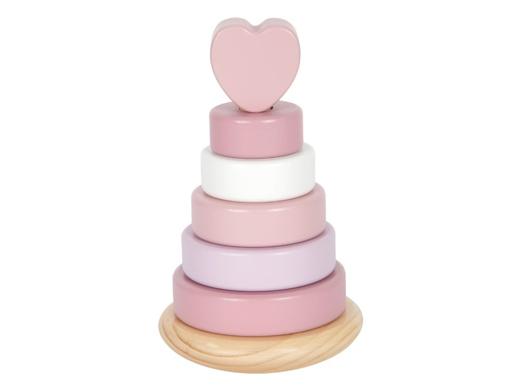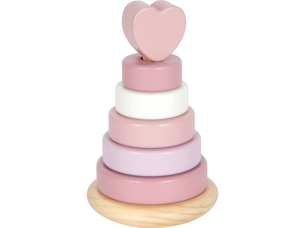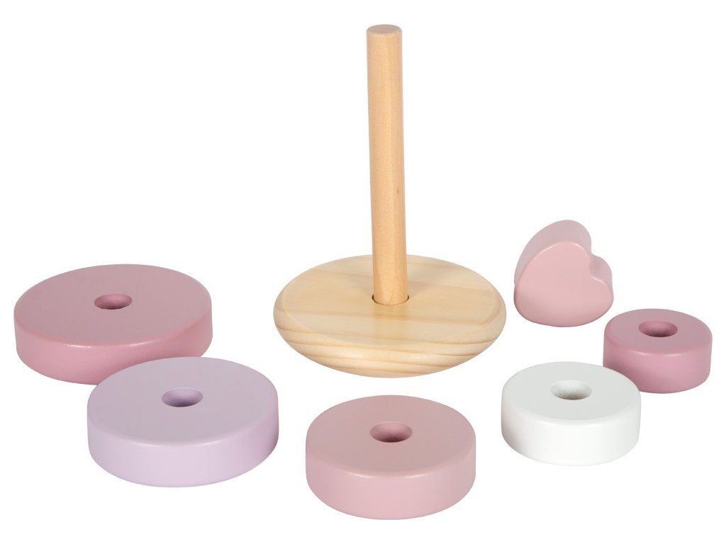 Tato dřevěná stohovací věž v jemných pastelových odstínech růžové s přírodními prvky je zakončena srdcem, které hračce dodává osobité kouzlo. Různě barevné a velikostně odstupňované kroužky pomáhají dětem procvičovat jemnou motoriku, soustředění i vnímání velikostí. Věž má zaoblenou základnu, díky které se může lehce pohupuje – to z ní dělá nejen edukativní, ale i zábavnou hračku. Bezpečná, pohyblivá centrální tyč se při zatlačení ohýbá, což zajišťuje větší bezpečnost při hře i snadnější navlékání kroužků.