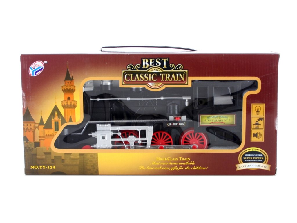 Plastová lokomotiva na 6 AA baterií. Velikost lokomotivy cca 35 cm. Svítí, houká a kouří. Lokomotiva má uvnitř elektrickou spirálu a speciální netoxický kouřící olej. Zahříváním spirály se vytváří kouř. Rozměry balení cca 39 x 11,5 x 18,5 cm. Věk 3+Doplňkové parametry