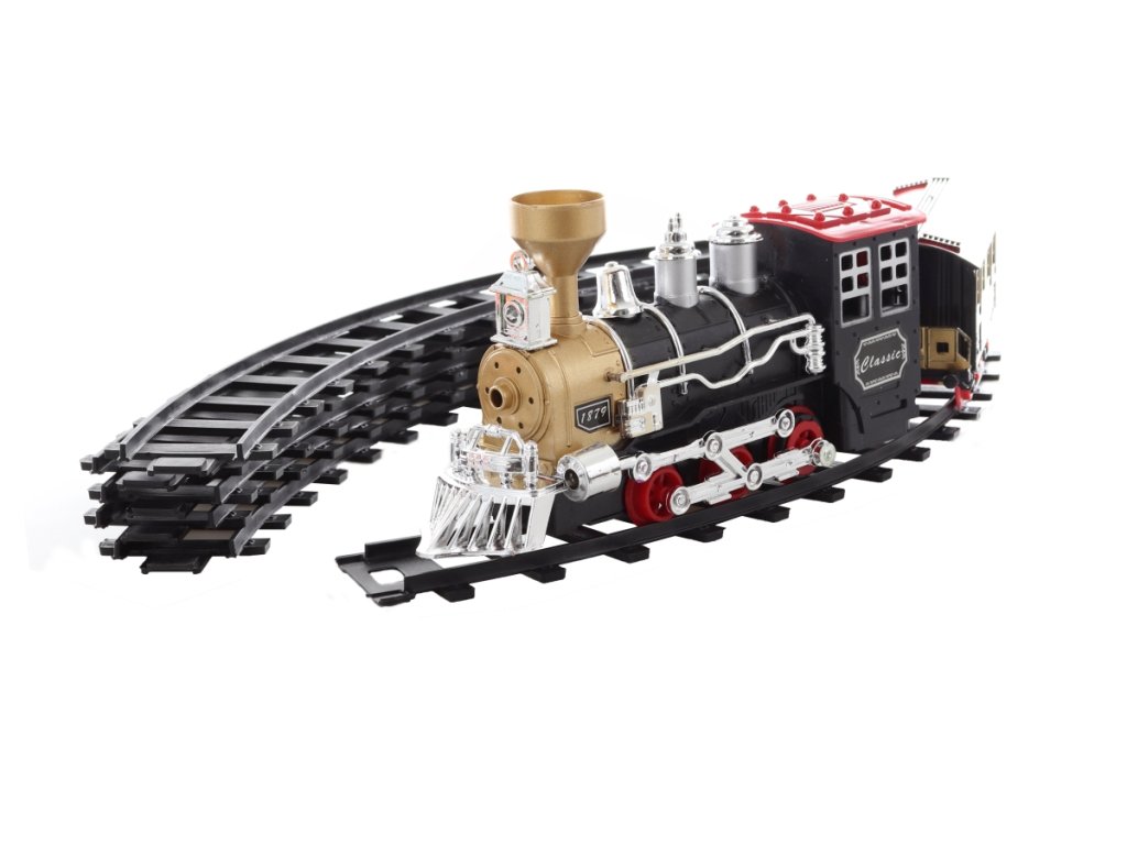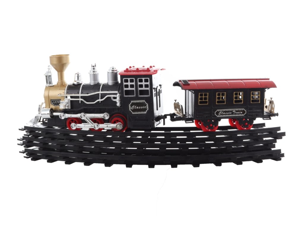 Plastová vláčkodráha s lokomotivou na baterie. Lokomotiva svítí, vydává zvuky a kouří. Napájení na 4 AA baterie (nejsou součástí). Balení obsahuje 6 kolejí, lokomotivu a vagón. Rozměry balení cca 41,5 x 22,5 x 7 cm. Věk 3+Doplňkové parametry