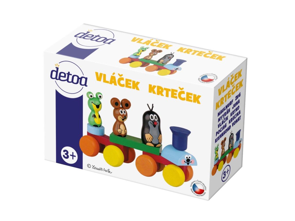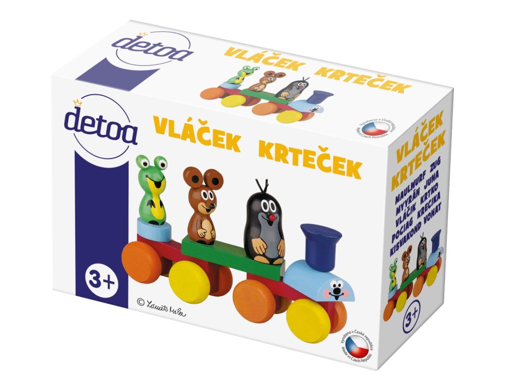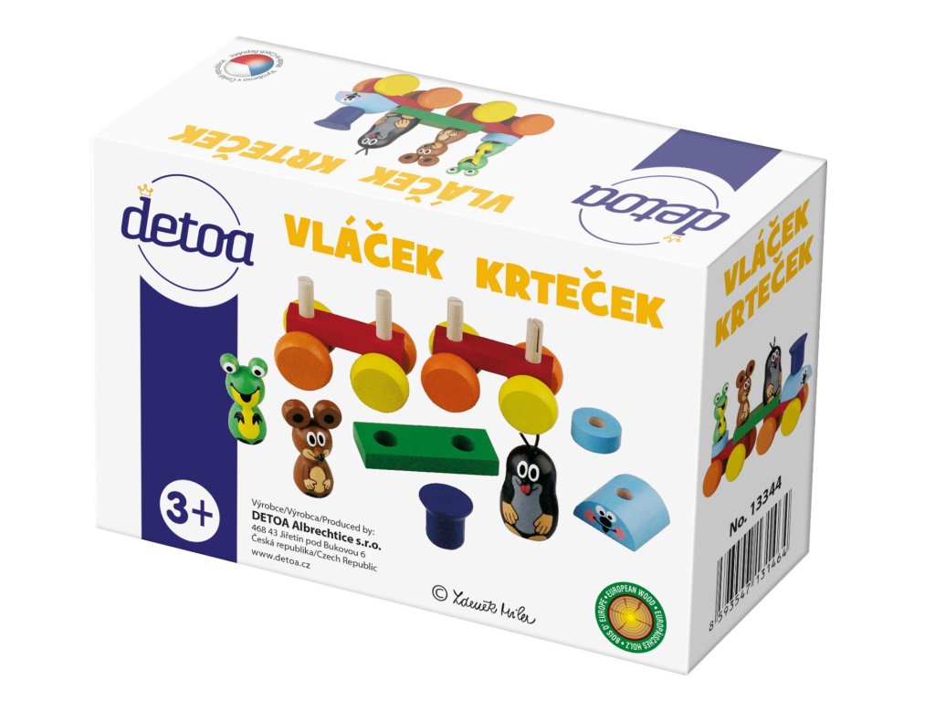 Vláček Krteček je rozkládací, lze libovolně měnit pořadí figurek. Mašinka má dva obličeje – veselý a udivený.Výrobek splňuje požadavky EU na bezpečnost hraček a je vhodný pro děti od 3 let.