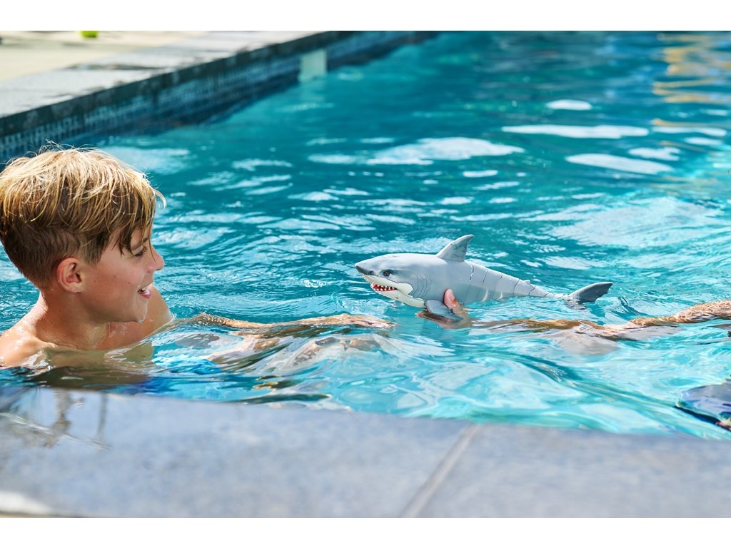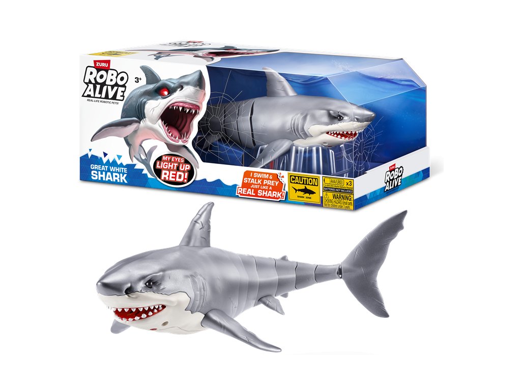 Jste připraveni zkrotit velkého bílého žraloka, nebo se stanete jeho další kořistí? Tento žralok ožívá ve vodě díky nejmodernější vodou aktivované technologii od společnosti ZURU a plave jako skutečný mořský predátor. Realistické pohyby Pohybuje se ve vodě jako skutečný žralok - ideální pro žertíky a překvapení. Svítící oči Sledujte, jak jeho oči ve vodě červeně září, když žralok pronásleduje svou kořist. Aktivace vodou Speciální technologie probouzí žraloka k životu po ponoření do vody. Perfektní na žertíky Překvapte své přátele a sledujte jejich šokované reakce, když uvidí plavat tohoto realistického žraloka. Technické údaje Velikost: přibližně 40 cm Baterie: 3x AAA/LR03 (jsou součástí balení) Značka: Zuru / Robo Alive Doporučený věk: 3+ let Tato robotická hračka přináší vzrušení do každé koupele, bazénu nebo vodní plochy! Dejte dětem možnost zažít napětí z bezpečného setkání s jedním z nejobávanějších mořských tvorů.Doplňkové parametry