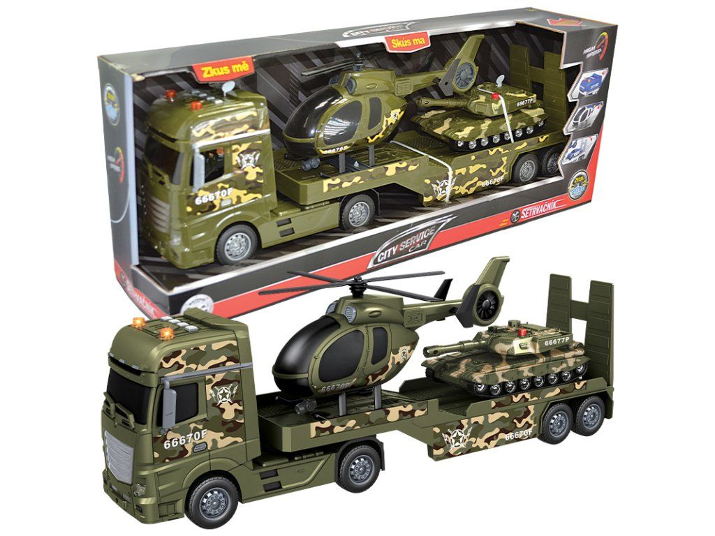 Představujeme vám CITY SERVICE CAR - 1:12 Vojenský tahač s vrtulníkem a tankem, dokonale vyrobený hračka model, který zaručeně rozsvítí oči každého malého dobrodruha.