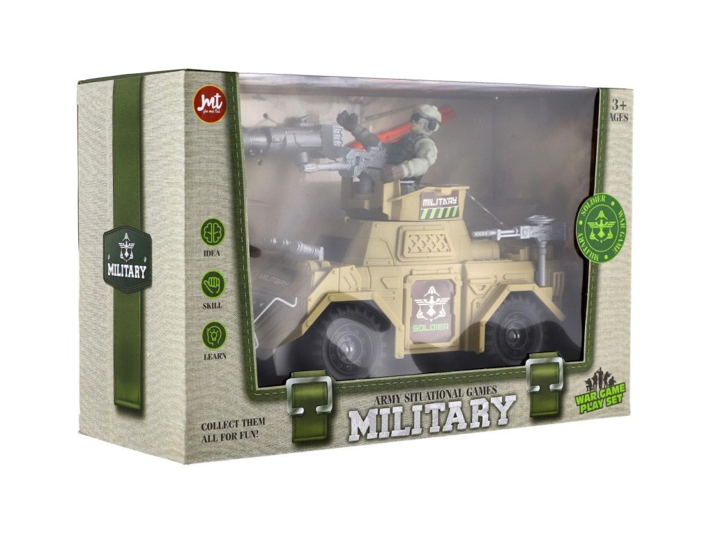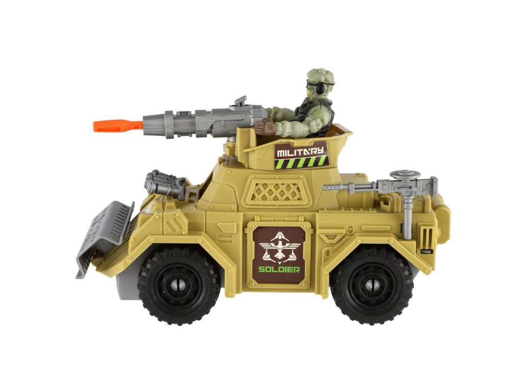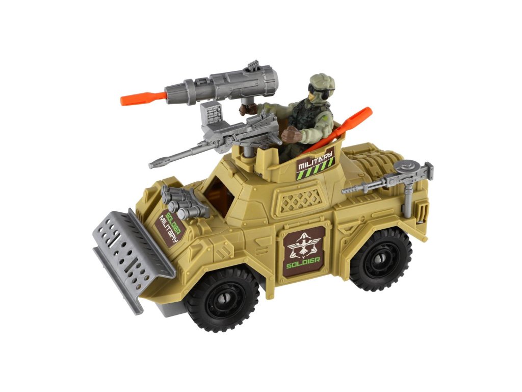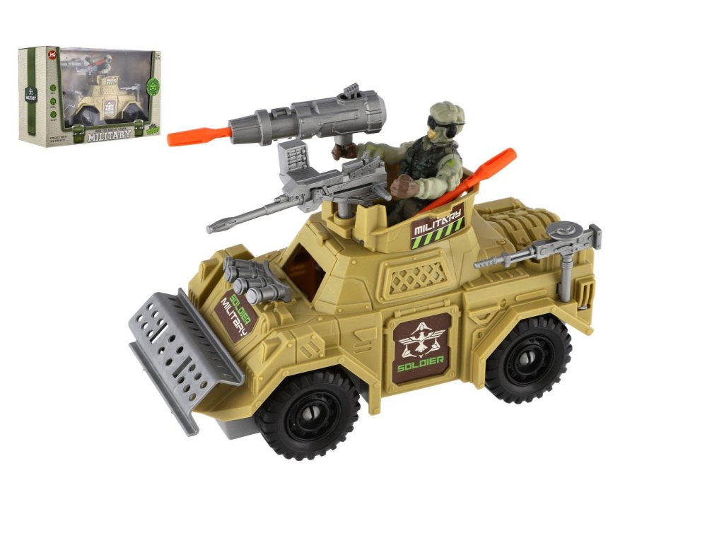 Vojenská sada obrněné auto+voják s doplňky plast na volný chod v krabici 27x18x12cm
