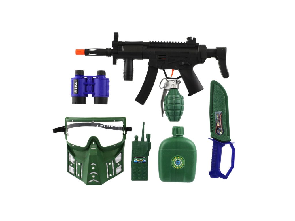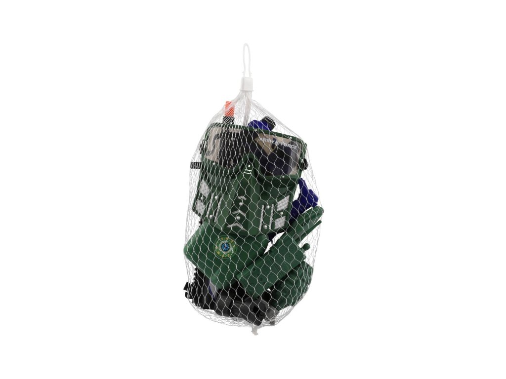 Připrav se na akci! Tato vojenská sada obsahuje plastový klapací samopal o délce 32 cm a tematické doplňky pro malé vojáky. Ideální pro akční hry, které podporují představivost, pohyb a dobrodružného ducha. Vše prakticky baleno v síťce.Délka samopalu: cca 32 cm