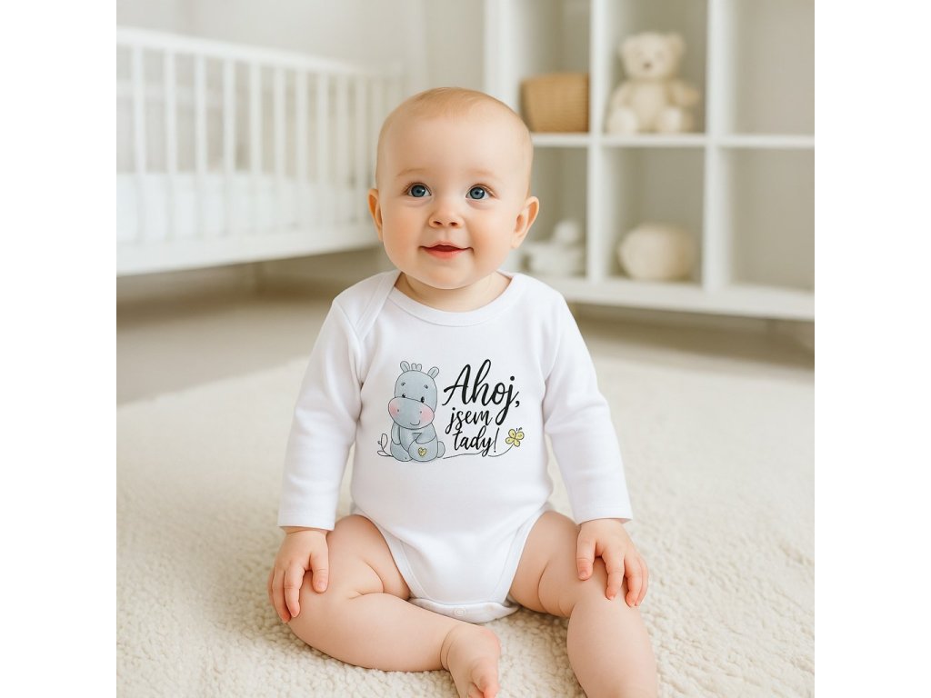 Originální bavlněné kojenecké body s dlouhým rukávem New Baby, s roztomilým obrázkem a nápisem Ahoj, jsem tady! Body má kolem krčku, nožiček a ručiček barevné lemování. Barvy použité k potisku jsou certifikované a vhodné pro miminka. Je vyrobeno z příjemného a kvalitního materiálu, ve kterém se bude Vaše miminko cítit příjemně. Body má zapínáni na cvočky na ramínku a mezi nožičkami, což usnadňuje oblékání a přebalování. Dopřejte Vašemu miminku vyniknout v originálním body. Složení: 100% bavlna.