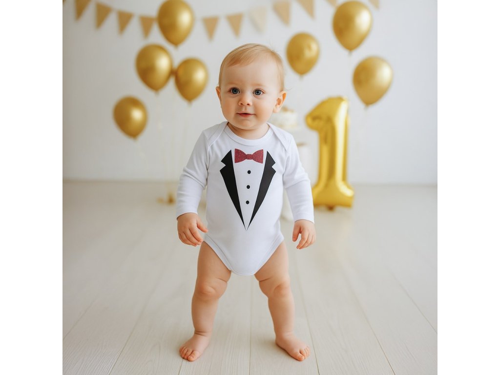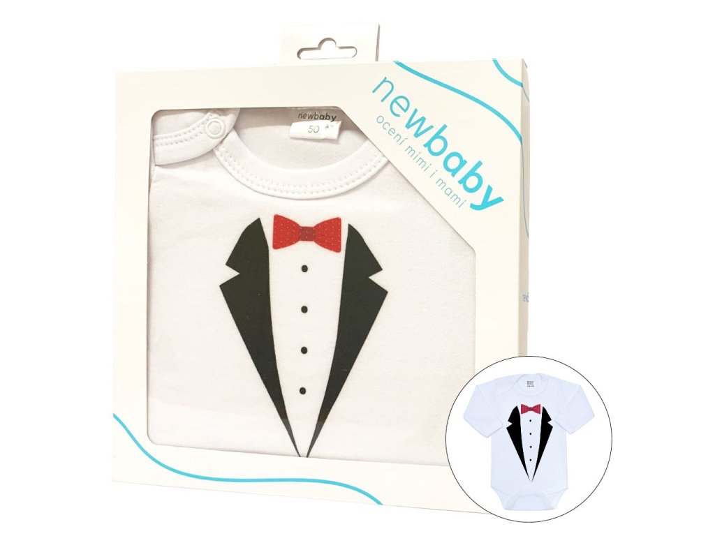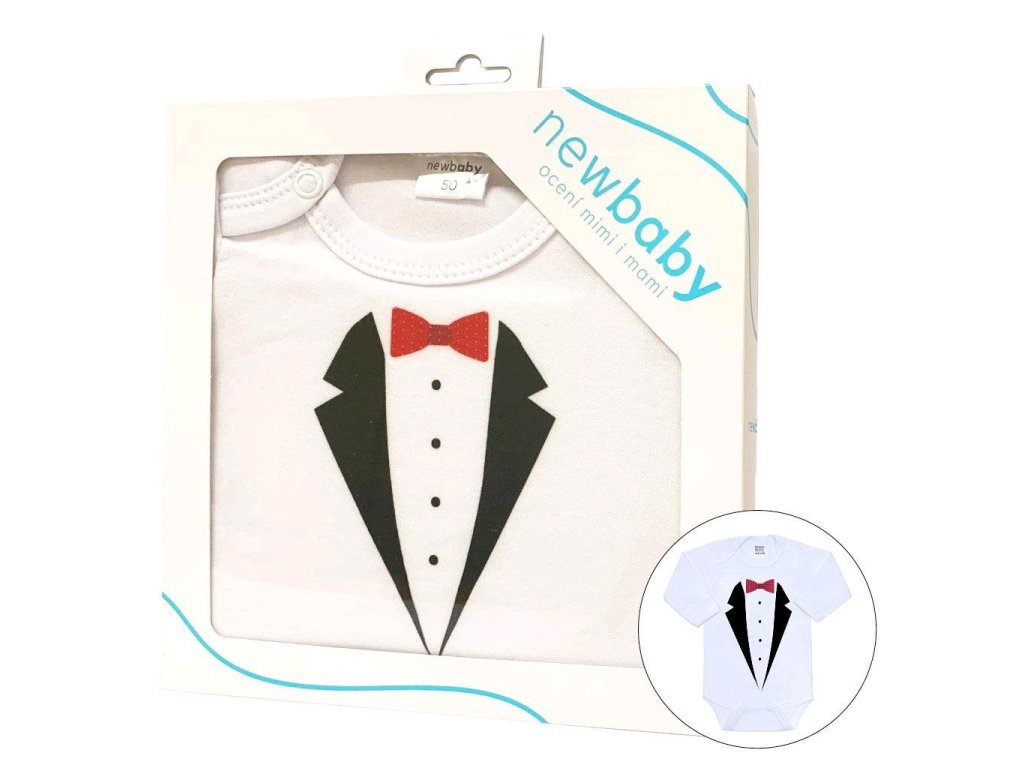 Originální bavlněné kojenecké body s dlouhým rukávem New Baby, s obrázkem smokingu. Barvy použité k potisku jsou certifikované a vhodné pro miminka. Je vyrobeno z příjemného a kvalitního materiálu, ve kterém se bude Vaše miminko cítit příjemně. Body má zapínáni na cvočky na ramínku a mezi nožičkami, což usnadňuje oblékání a přebalování. Dopřejte Vašemu miminku vyniknout v originálním body. Složení: 100% bavlna.