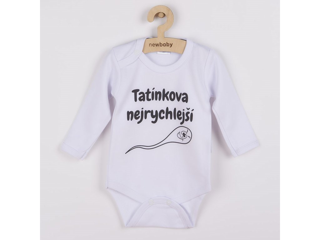 Originální bavlněné kojenecké body s dlouhým rukávem New Baby, s vtipným nápisem TATÍNKOVA NEJRYCHLEJŠÍ. Barvy použité k potisku jsou certifikované a vhodné pro miminka. Je vyrobeno z příjemného a kvalitního materiálu, ve kterém se bude Vaše miminko cítit příjemně. Body má zapínáni na cvočky na ramínku a mezi nožičkami, což usnadňuje oblékání a přebalování. Dopřejte Vašemu miminku vyniknout v originálním body. Složení: 100% bavlna.