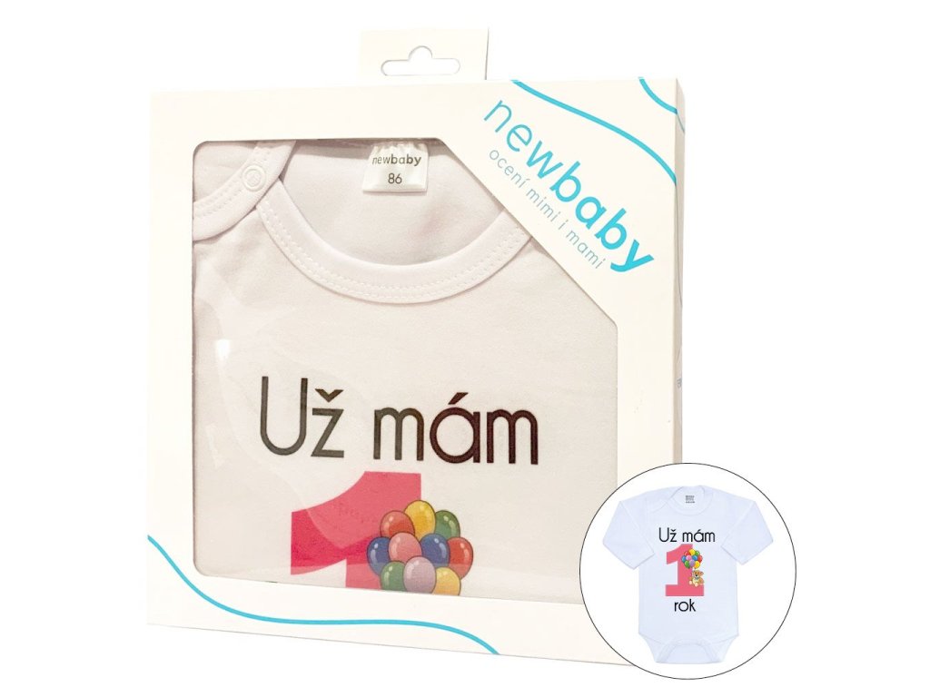 Body s potiskem New Baby Už mám 1 rok růžové - dárkové balení