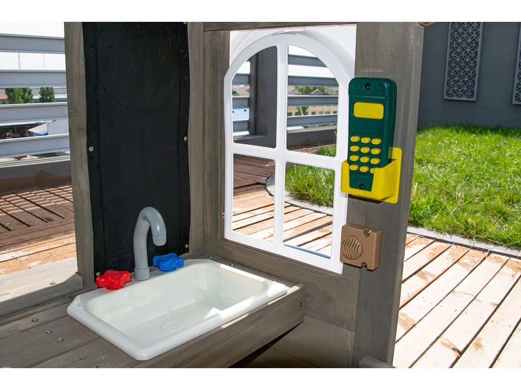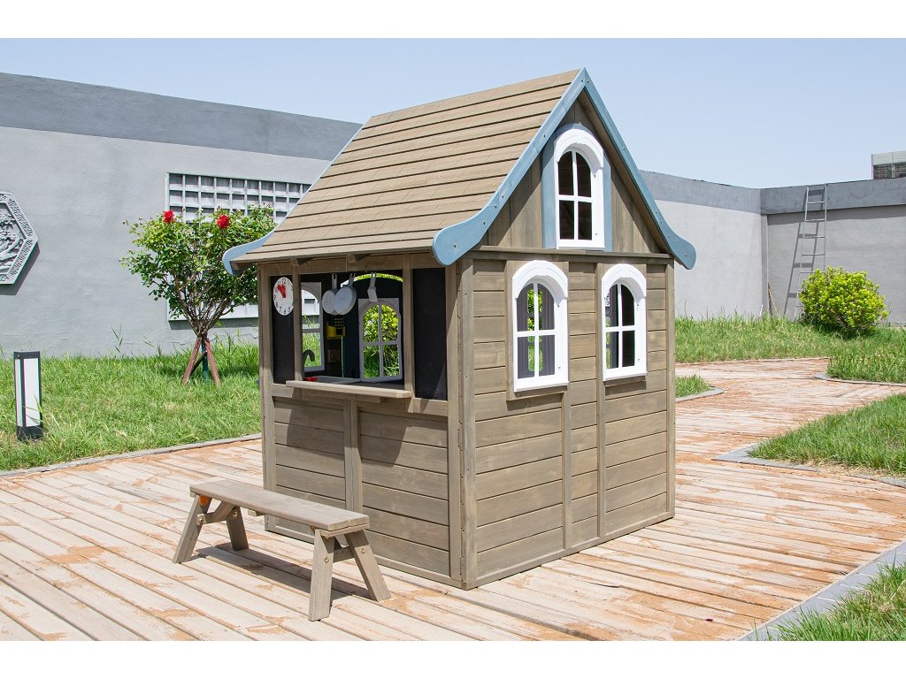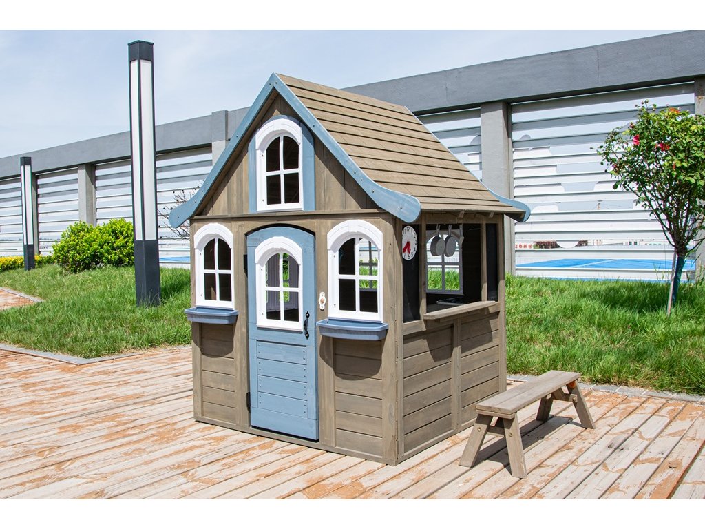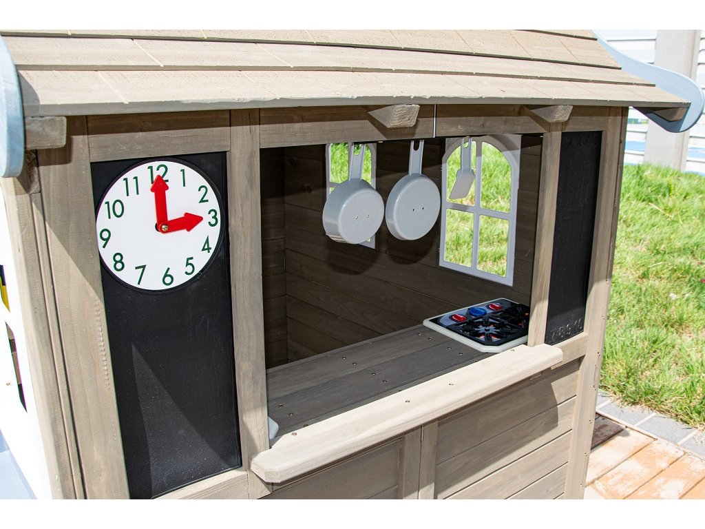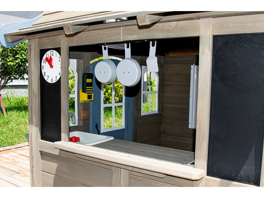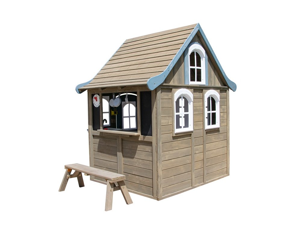 Pro větší odolnost proti povětrnostním vlivům doporučujeme další ošetření dřevěných dílů. Domeček obsahuje: lavici na sezení (nosnost 50 kg)výdejní okno se servírovacím pultemfunkční zvonek (baterie 2xAAA/LR03 – nejsou součástí balení)kuchyňský dřez a hořák na vaření se 2 pánvemi a obracečkou2 truhlíky na květiny2 kreativní tabule s 1 hodinami Hlavní vlastnosti: rozvíjí sociální dovednostiútulný designkvalitní a detailní provedeníplastová oknatloušťka dřevěných stěn 2,7 cmdřevo ošetřeno nátěremvhodné pro hru více dětí Informace pro B2B partnery: dropshipping v rámci ČR!