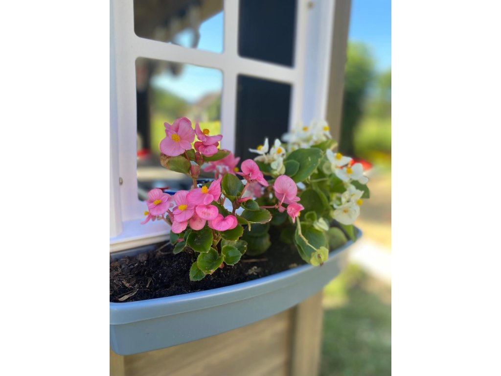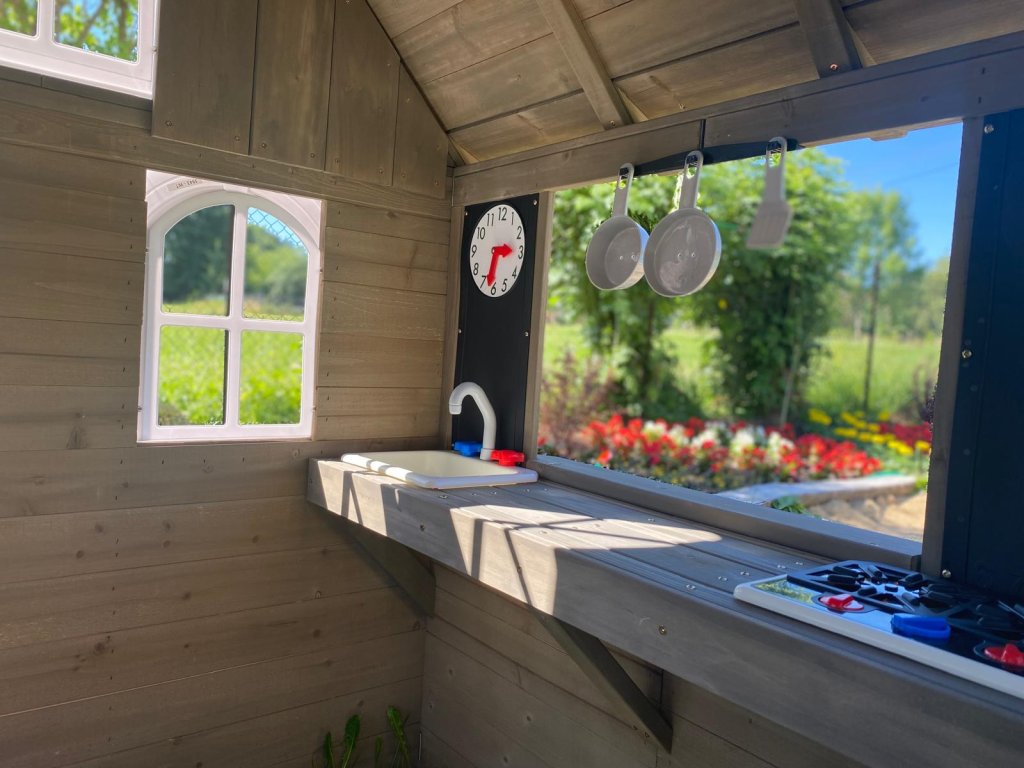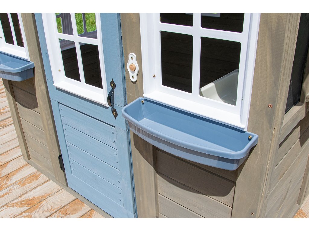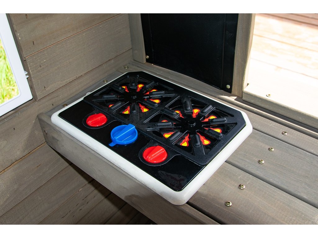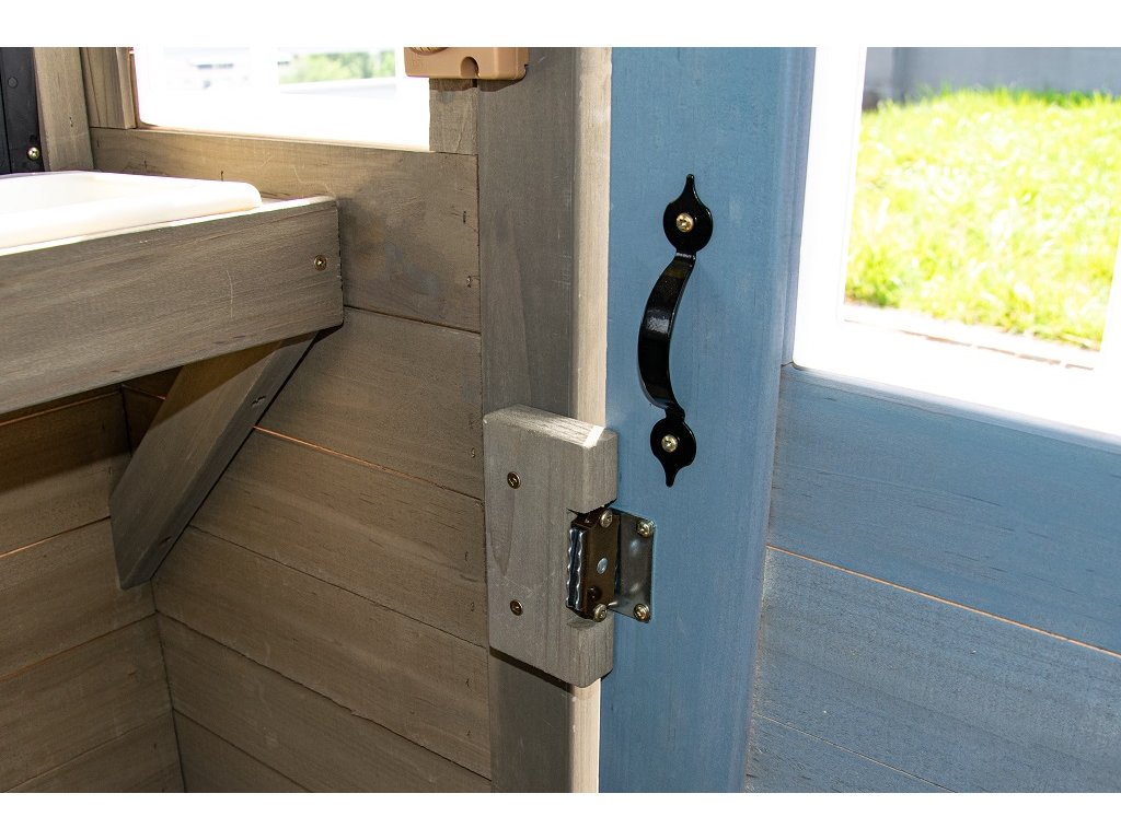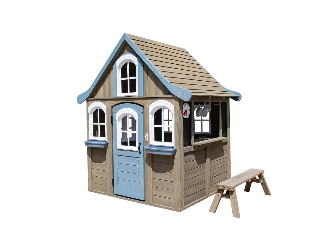 Pro větší odolnost proti povětrnostním vlivům doporučujeme další ošetření dřevěných dílů. Domeček obsahuje: lavici na sezení (nosnost 50 kg)výdejní okno se servírovacím pultemfunkční zvonek (baterie 2xAAA/LR03 – nejsou součástí balení)kuchyňský dřez a hořák na vaření se 2 pánvemi a obracečkou2 truhlíky na květiny2 kreativní tabule s 1 hodinami Hlavní vlastnosti: rozvíjí sociální dovednostiútulný designkvalitní a detailní provedeníplastová oknatloušťka dřevěných stěn 2,7 cmdřevo ošetřeno nátěremvhodné pro hru více dětí Informace pro B2B partnery: dropshipping v rámci ČR!