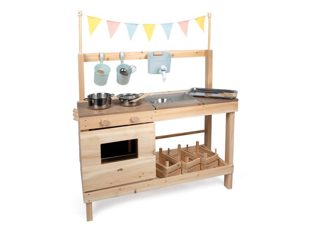 Tato vysoce kvalitní, extra velká venkovní dětská kuchyňka se stánkem z masivního dřeva nabízí jedinečný zážitek z hraní venku. Je přístupná z obou stran a vybavená množstvím doplňků – z jedné strany slouží jako kuchyňka pro vaření, míchání a experimentování s vodou či hlínou, z druhé strany jako obchod nebo dílna, která podporuje kreativní hraní na nakupování a prodej. Mezi hlavní prvky patří trouba s otočnými knoflíky a výsuvným plechem, varná deska s gravírovanými symboly a designem dotykového ovládání a dřez s dávkovačem vody a kohoutkem. Nechybí ani grilovací plocha, tři dřevěné bedýnky, závěsné květináče, police, kovové nádobí, kuchyňské doplňky a také dekorativní vlaječka, která dodává celé kuchyňce jedinečný vzhled. Součástí je i křídová tabule, boční háčky, dostatek úložného prostoru a kontrastní pracovní deska. Praktické otvory na ukládání herního náčiní pomáhají udržet pořádek. Tato multifunkční venkovní kuchyňka a obchod zaujme nejen svým propracovaným designem a vodními prvky, ale i kvalitním zpracováním. Ať už ji děti využijí jako kuchyňku, dílnu nebo obchůdek, přirozeně rozvíjí jejich motoriku, jazykové dovednosti i sociální schopnosti při hraní rolí a poskytuje hodiny zábavy. Pro zachování dlouhé životnosti doporučujeme neošetřené dřevo pravidelně ošetřit ochranným nátěrem.