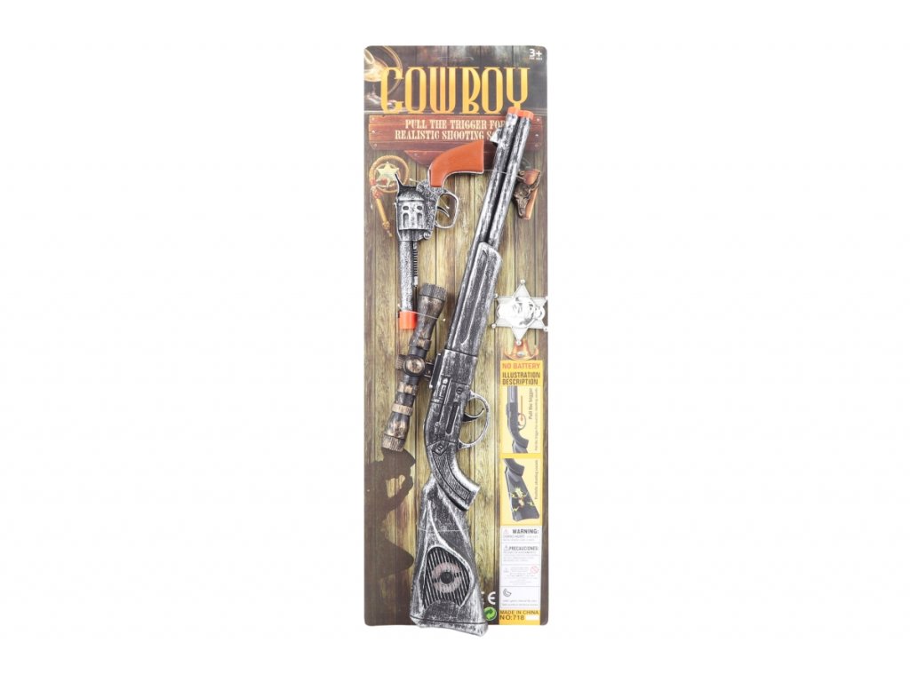 Sada pro kovboje obsahuje plastovou pušku se zaměřovadlem, pistol, odznak šerifa a přívěsek. Obě zbraně po stisknutí vydávají zvuk výstřelu, není potřeba baterie. Délka velké pušky cca 50 cm. Věk 3+.Doplňkové parametry